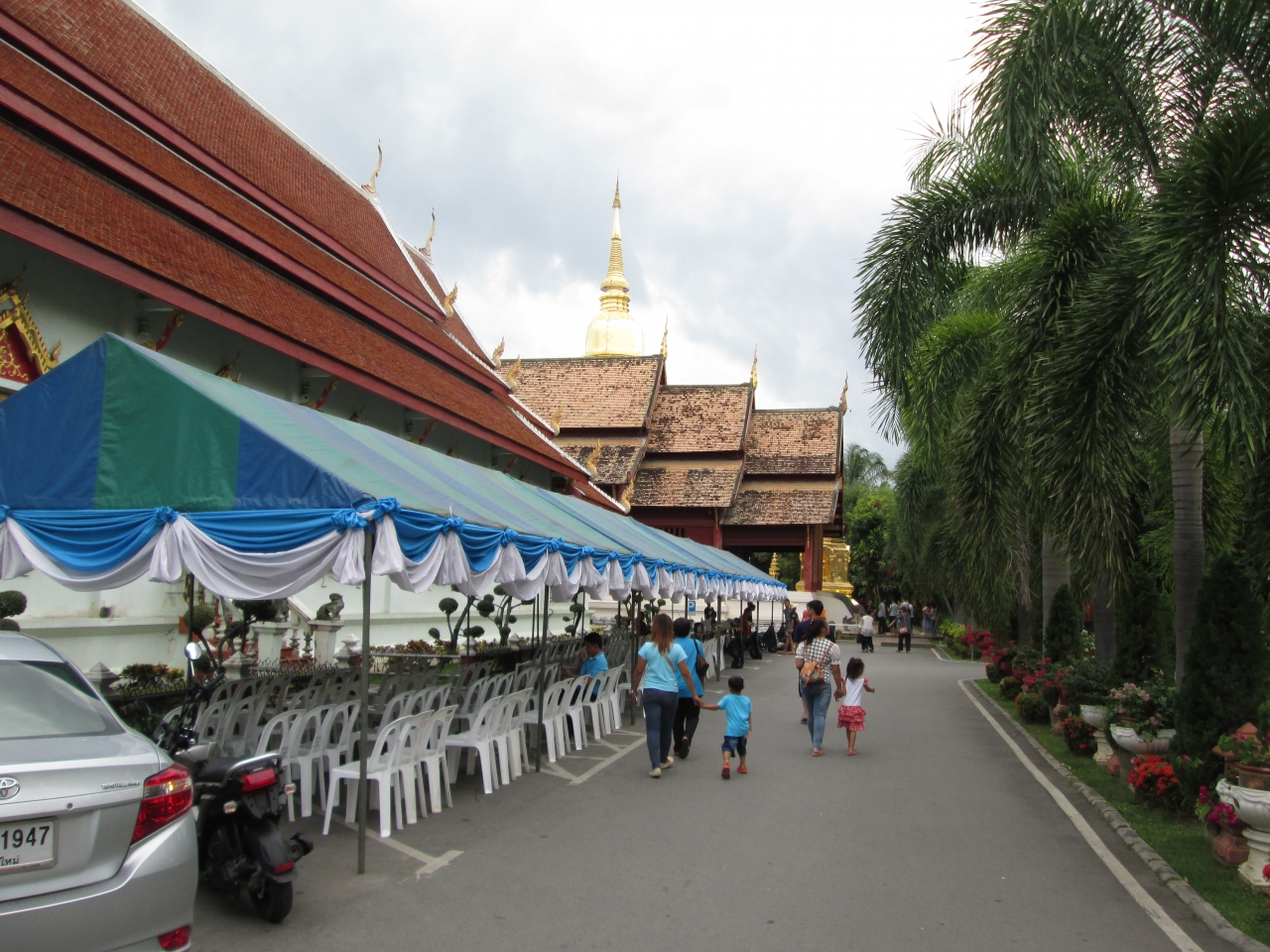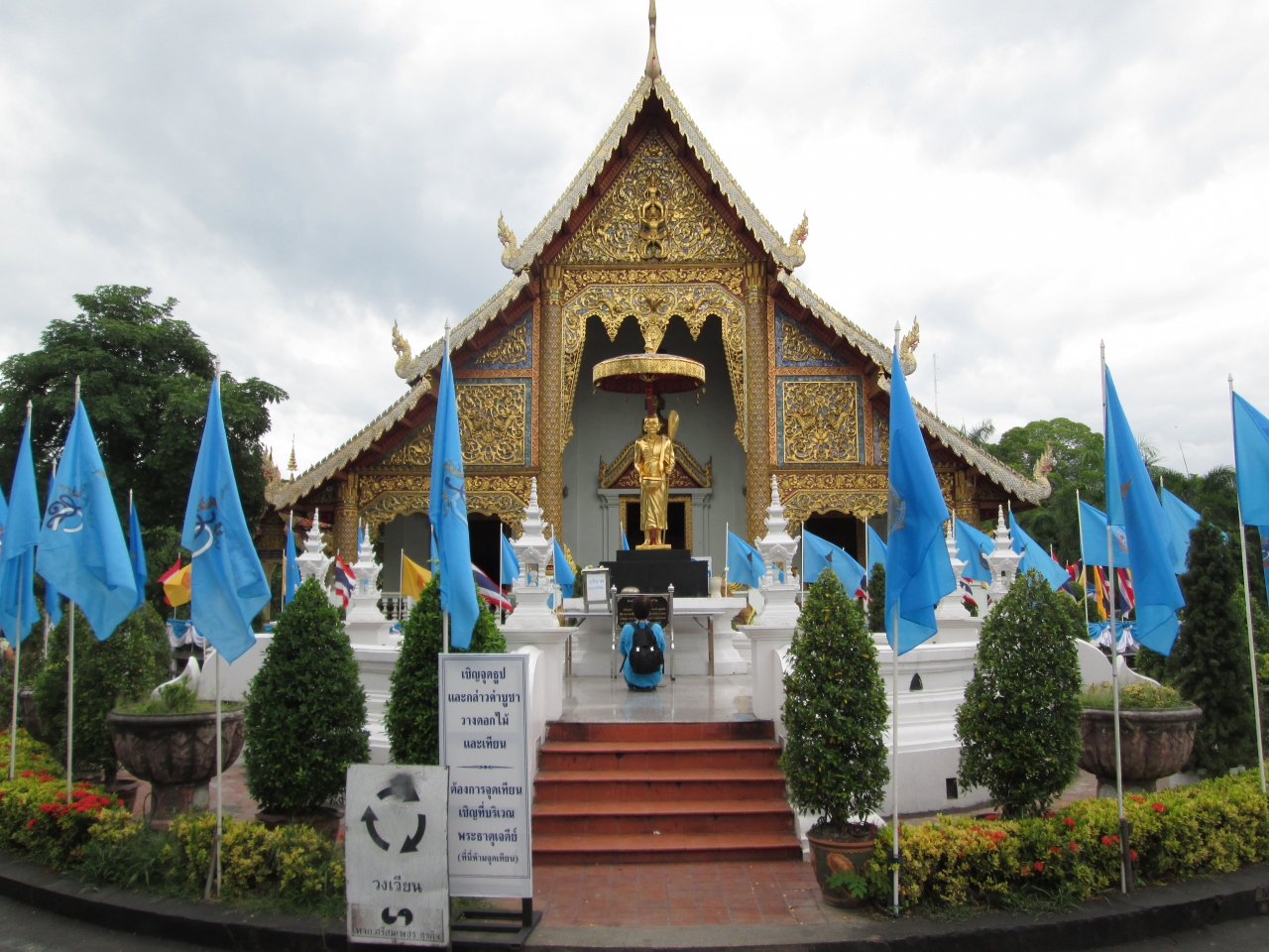8月12日はクイーンシリキット王妃生誕記念日で、タイにおける「母の日」でもあります。母の日が近づくとチェンマイの街中で王妃様の写真が飾られます。ワット プラシンには王妃様の写真があり、敬愛している王妃様の写真を撮影したり、境内にはシンボルカラーである青色の飾りが付いていました。