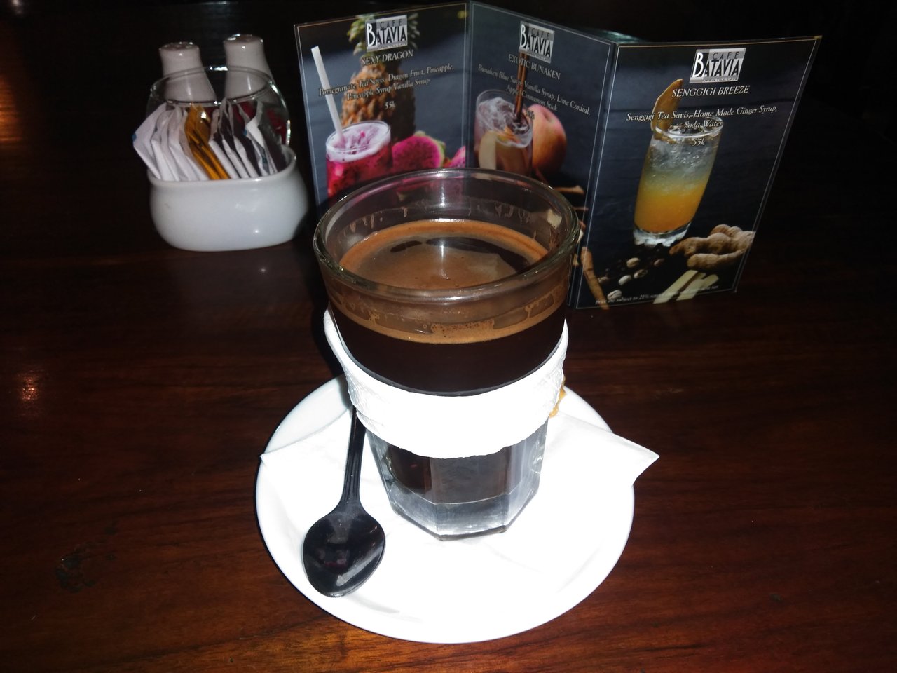 ジャカルタの観光場所コタ地区のファタヒラ広場の超有名カフェ。ガイドさんが、日本でのジャカルタ土産話に必要だから、と連れて行ってくれました。インドネシアコーヒーの豆は、アチャとパプアがオススメ。耐熱ガラスコップで持ちては紙で細工。美味しいです。