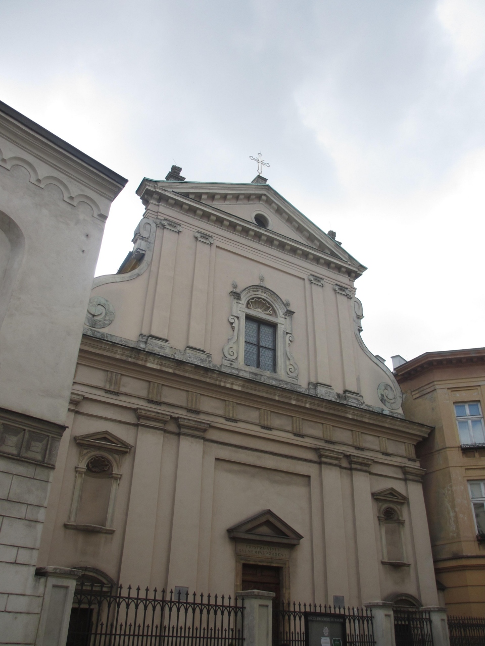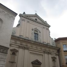 クラクフ旧市街を散策した際、中央広場からヴェルヴェ城に向かう途中に行きました。聖ペテロ聖パウロ教会、聖アンドリュー教会の次に見えてきます。3つの教会の中では一番小さかったですが、建物の上半分の左右の曲線が印象に残りました。