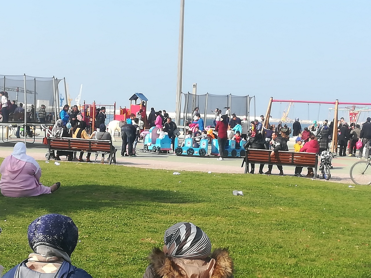 壁などなくフラットな場所なので タンジェ湾と浜辺を見渡せ とても気持ちよいです。芝生には何家族もレジャーシートを敷いている姿や、ボールで遊んでいるグループがいました。