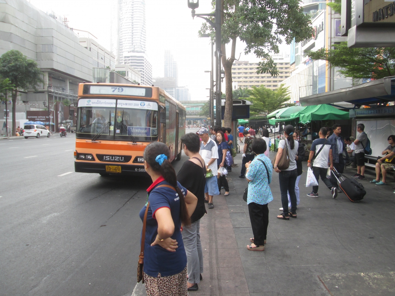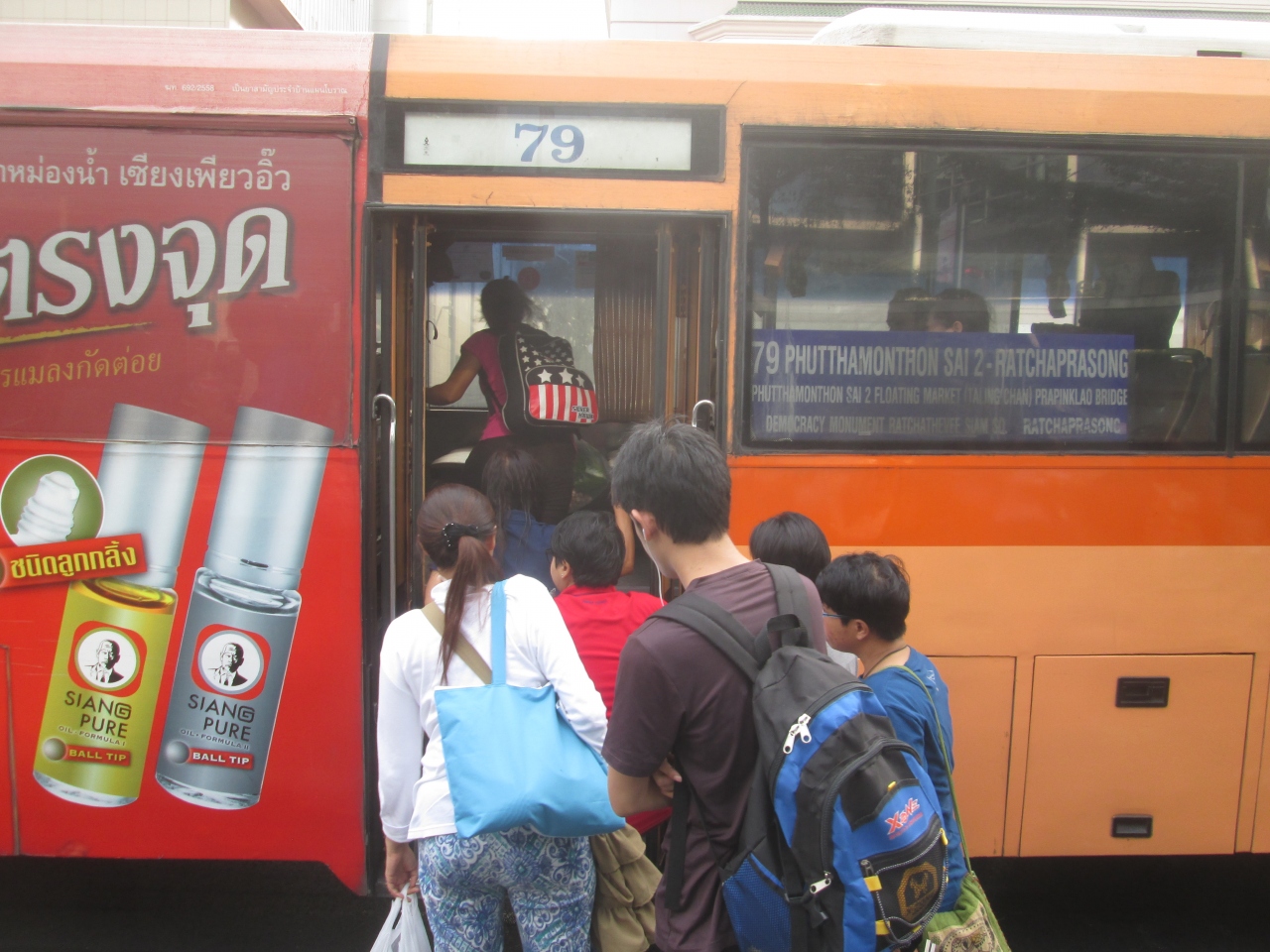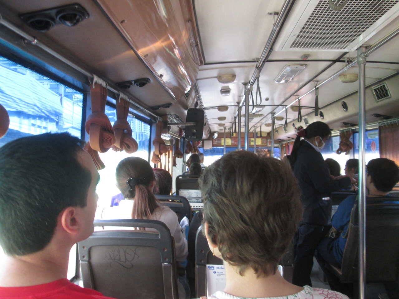 バンコクを走行しているバスの乗降口は日本と同様、前と中間に2カ所ありましたが、乗降する際、どちらでも対応していました。乗車すると整理券のピックアップは必要ない代わりに車掌がやってきて行き先の目安を告げると、支払うシステムでした。