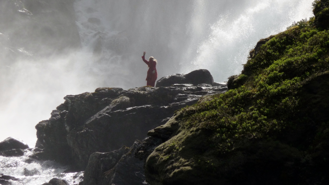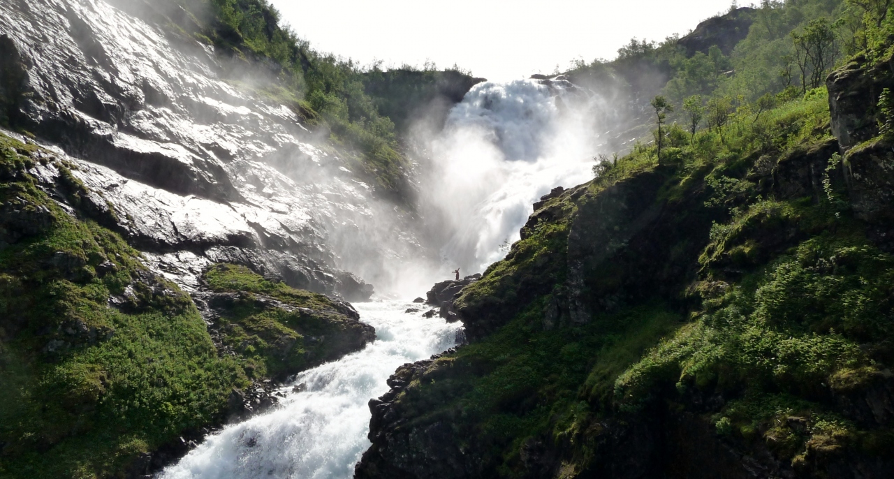 ミュールダール駅からフロム鉄道でフロムに向かうと間もなくショースの滝があります。電車もここで10分程度停車するので、皆下車して滝に向かいます。雪解け水を集めた水量豊富な滝は迫力満点でフロム鉄道のハイライトです。見ていると滝の岩の上に妖精が現れ歌いだします。周囲の自然と調和した北欧らしいシーンです。