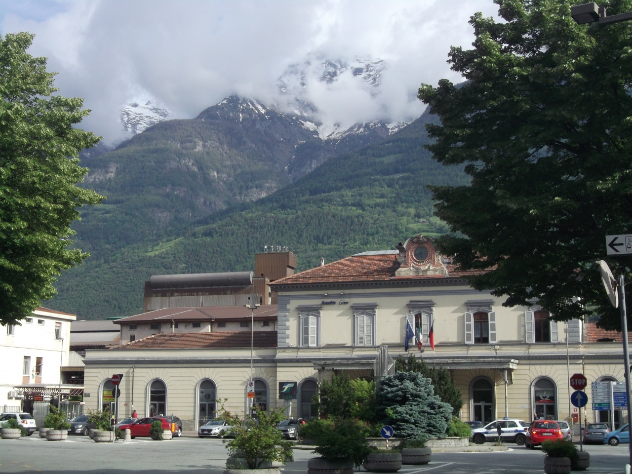ミラノから鉄道を乗り継いで3時間以上、イタリアの北西の端のフランスとの国境にも近いアオスタの駅です。トレニタリアはここが終点で、遠くまで来たという実感がわきます。廻りは高い山に囲まれた街なので、どの方向を見ても雪山が連なって見え、のどかな雰囲気が漂っていました。ここからはモンブラントンネルを通ってシャモニーに向かう路線など、近郊、遠距離の各地に向かうバスが発着しています。