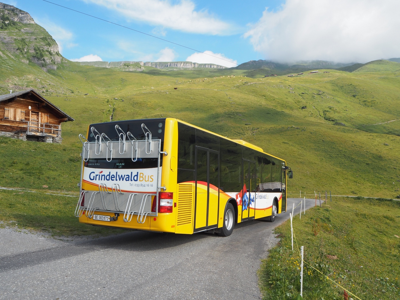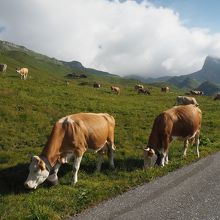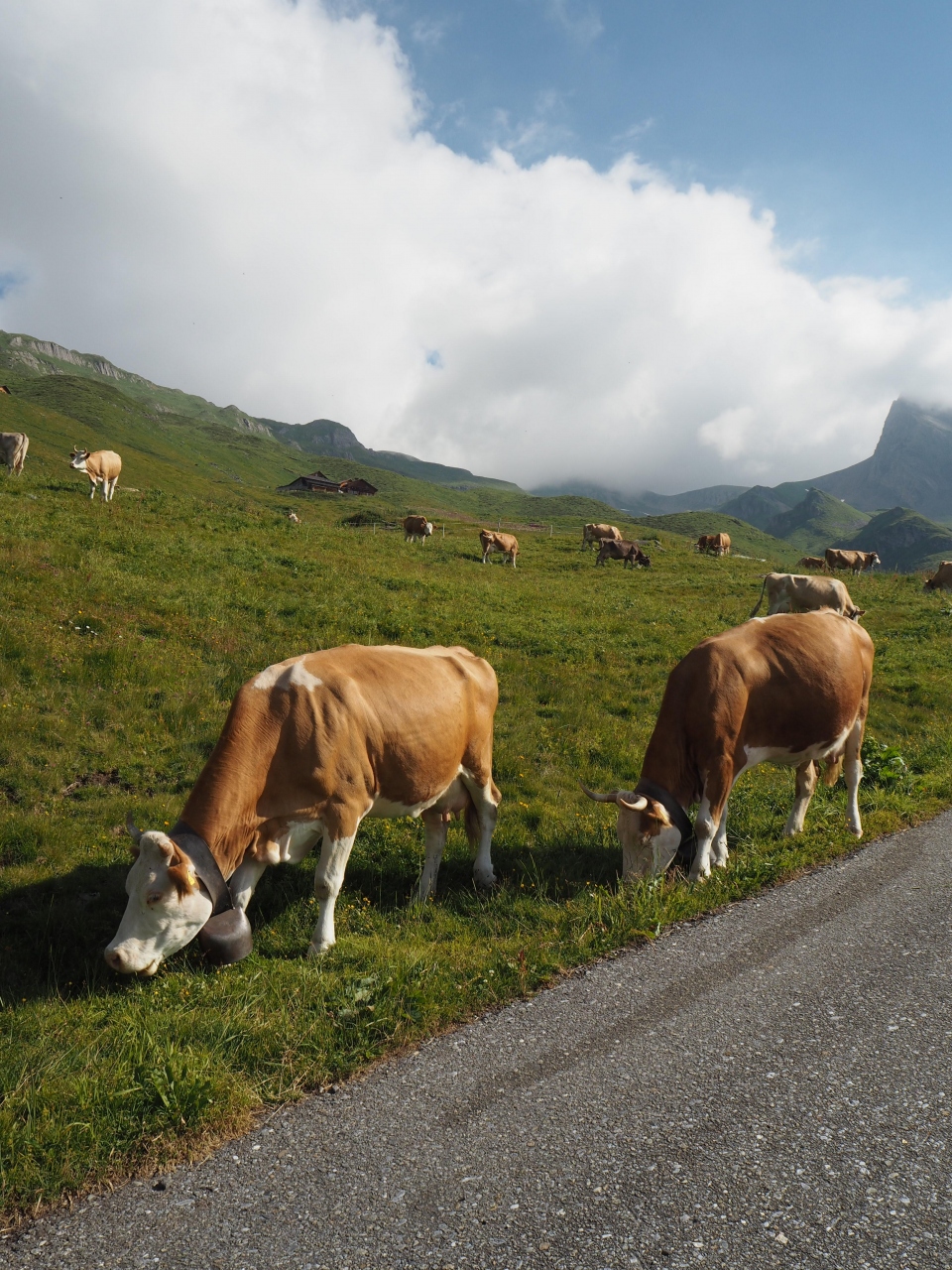 グリンデルワルト駅からバスで30分程で到着します。ハーフフェアカードで50%オフで一人往復23.80フランでした。細い道をバスで進んでいきます。酪農農家がいくつかあり牛を見れる可能性が高いと聞き、牛を見れることを期待して行きました。駅からまっすぐ登ったところにたくさんの牛がいたので丘を登ってハイキングしましたが、上り坂の行きは結構辛かったです。カウベルをつけたたくさんの牛を間近で見れてとてもよかったです。カウベルの音がとてもいいです。緑とアルプスのお花がいっぱいでした。人も少なく素晴らしい見晴らしの景色を堪能できます。登ったところは、ハイキングコースとして道がわかりにくかったですが、赤と白のマークを探しながら進むと無事進めました。