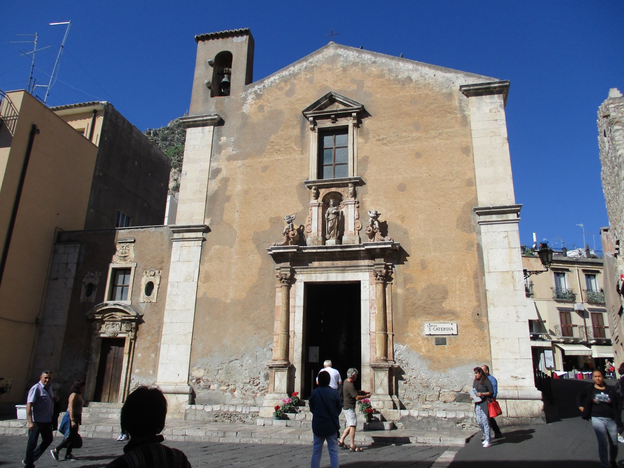 タオルミーナ旧市街散策の東側の入り口、メッシーナ門をくぐりぬけるとすぐの所にある教会です。正面から見ると壁の下の方ははがれ落ちてレンガがむき出しになっていて、長い年月の経過を感じさせます。入り口はいつも開いていてまさに街に溶け込んだ教会という感じがしました。