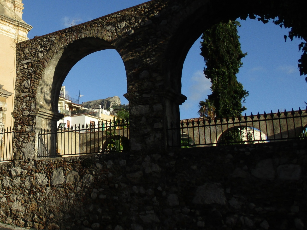 タオルミーナの旧市街を歩いていると、いろいろなところで城塞の跡を目にします。石を組み込んだ壁やアーチは街の風景の中に溶け込んでいるような感じで、独特の景観を醸し出していました。思いがけない出会いを楽しみながら、遠い昔の時代に思いをはせて散策を楽しみました。
