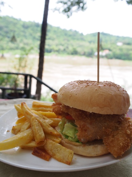 メコン川の川沿いにあるカフェの一つで、名物はメコン川でとれた魚のフィッシュバーガーだそうなので旅の思い出にと行ってみました。