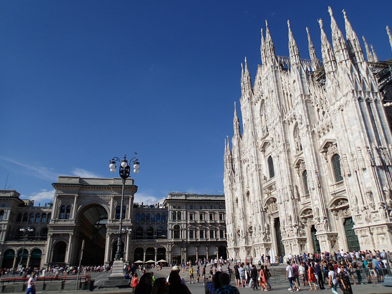 この広い広場があることでドゥオーモの全体を眺めることができ、ただでさえ壮大なドゥオーモの景観が一層引き立ちます。すぐ横には19世紀にできたアーケード「ヴィットリア・エマヌエーレ2世のガッレリア」があり、ドゥオーモと並んだ様はとても絵になります。