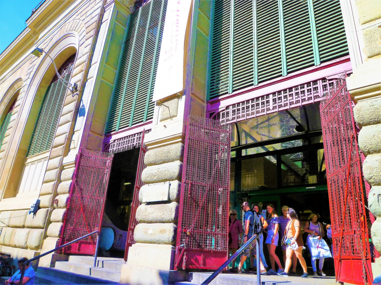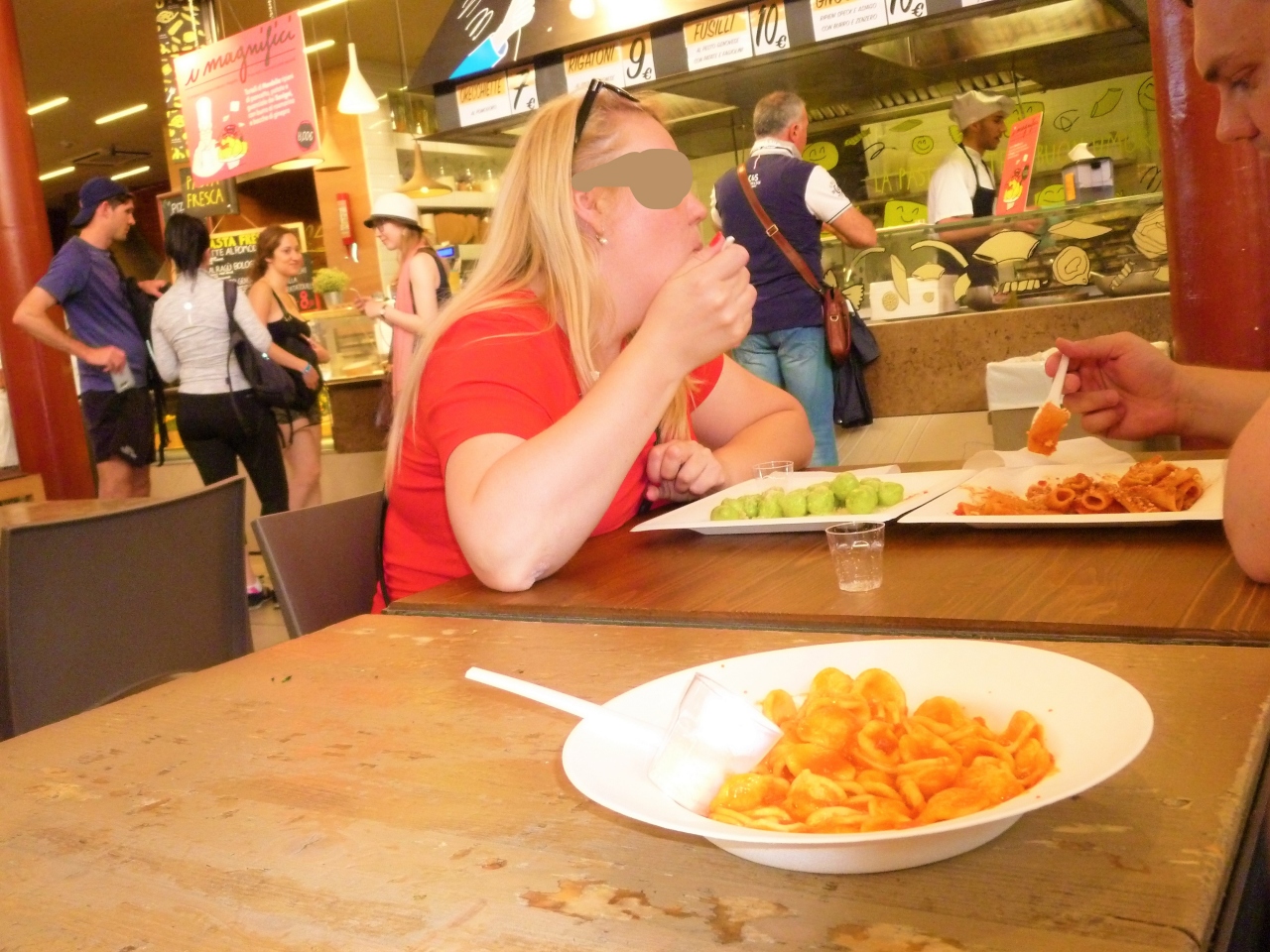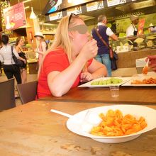 ホテル(アルバーニ フィレンツェ)から近いこともあって{中央市場]で夕食を食べました。2階がフードコートです。先ずその内装が目に留まりました…支える鉄骨が剝き出し/大きい傘状デザインの飾りを屋根からでした。フードコートではパスタやピザの専門店/中には鮮魚店もがあって自由に座って! パスタ店からトマトパスタと鮮魚店からフライを、写真はフライの順番待ち(^^)