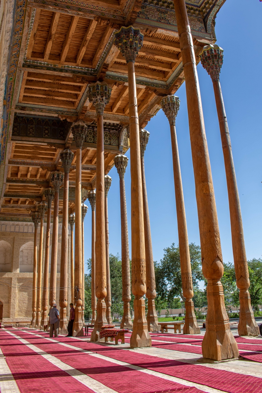 彫刻が施された20本の高い柱が天井を支え、モスクの前にある池に映ると40本に見えるという特徴的なデザイン。天井は赤や緑といった鮮やかな色使いで豪華絢爛だ。ヒヴァでも同じ様式を見たし、これがウズベクスタイルなのでしょうか。