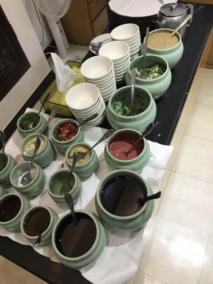 タレは十数種類の調味料を好みで混ぜて作ります。初回は店員さんにお願いして作っていただきました。