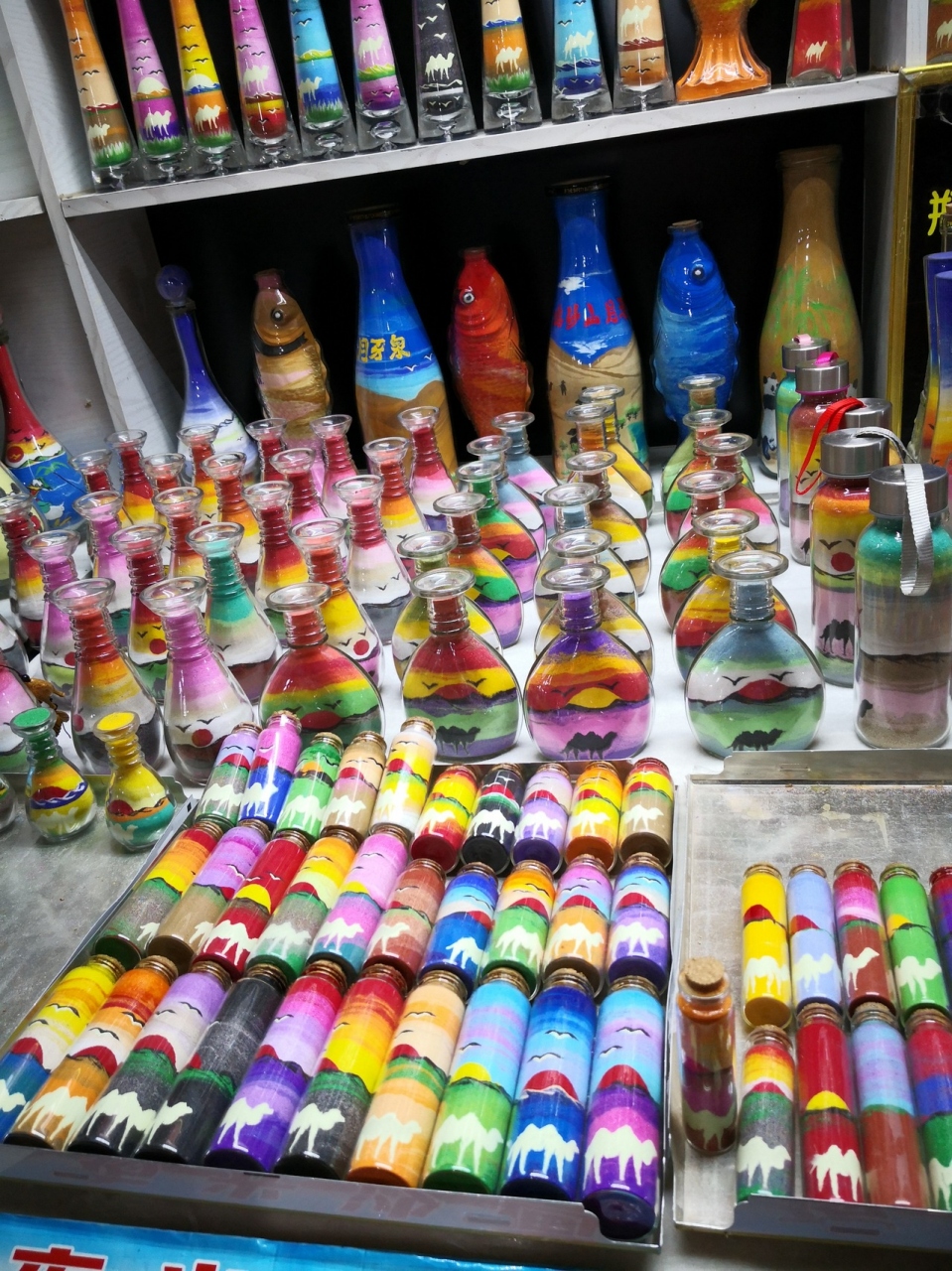 ボトルに色の付いた砂を入れて絵を書く工芸品を実演販売してて面白かったです。更にこの砂は、暗いところに持っていくと光るのです。お土産に欲しくなるものでした。