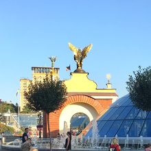 キエフの中心部・独立広場にある黄色と茶色の小さな門。これはかつてペチェルスキエ門という城門がこの地にあった名残です。門のてっぺんには聖ミカエルの黄金像がついています。また近くにある丸いドームは地下街およびモールへつながっています。