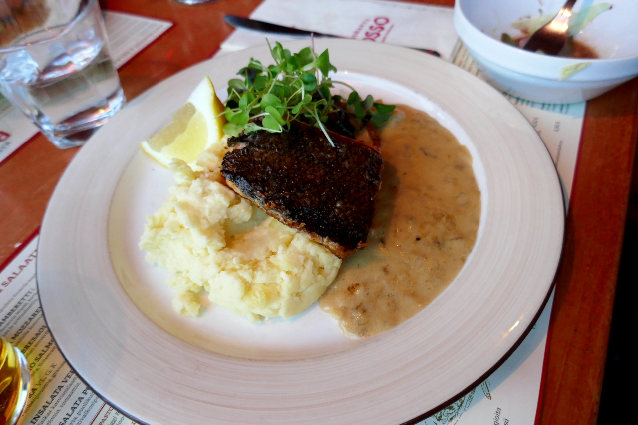 夕食をイタリアレストランRossoで食べる.まあ普通のレストラン ワインはLauraが選んでくれて安い割にはおいしかった ファミレスのようだがランチの時の様には安くはない Salmone con Porcini 21.5ユーロ 海のパスタ 15.9ユーロ 他にビール7.5ユーロ Gato Negroという赤ワイン 29.95ユーロ 水1ユーロ しめて128.25ユーロ ひとり32ユーロと決して安くはない 救いは赤ワインが思った以上においしかったこと!このようなファミレス風のところにしては,なかなかのワインだった
