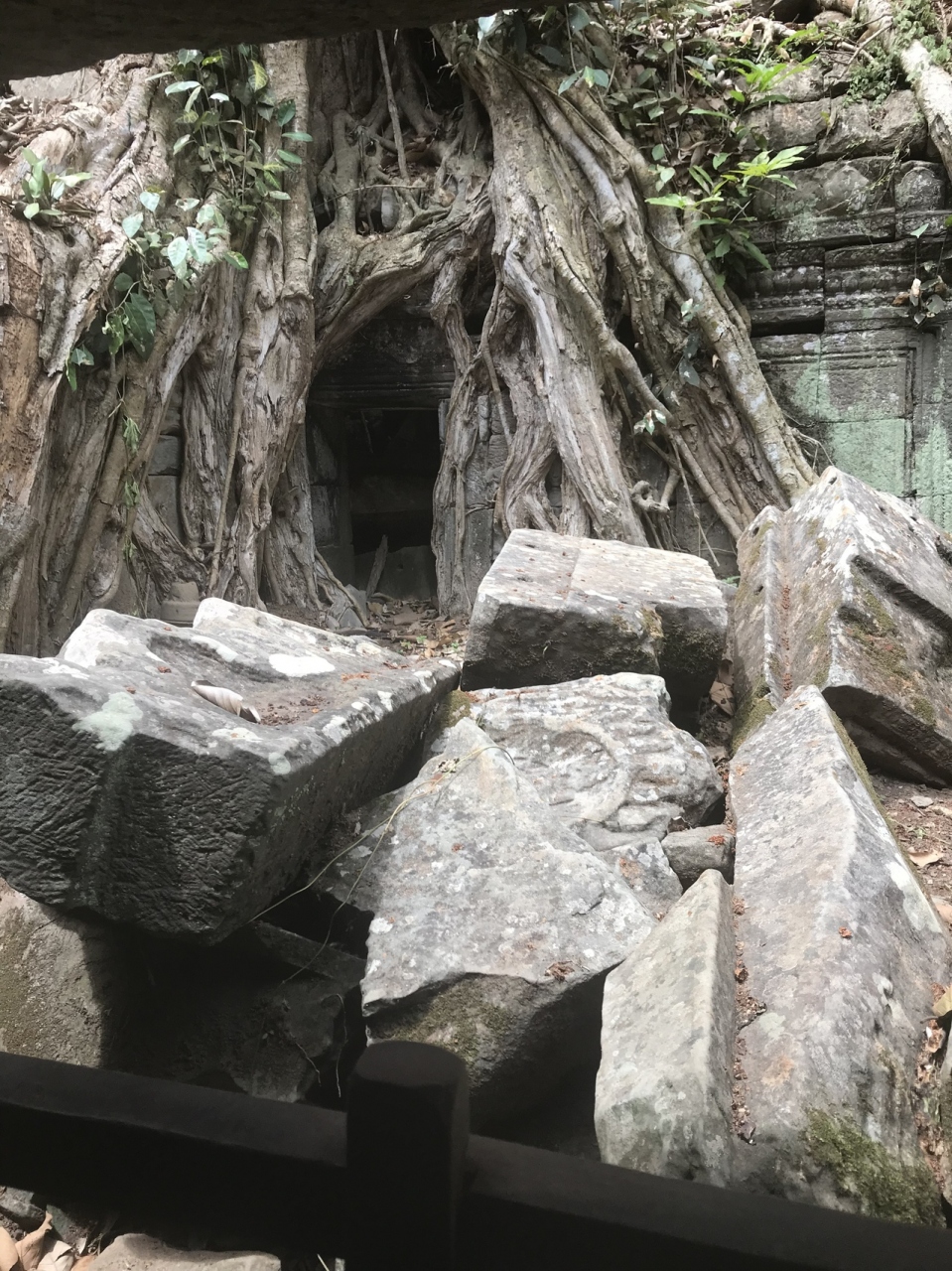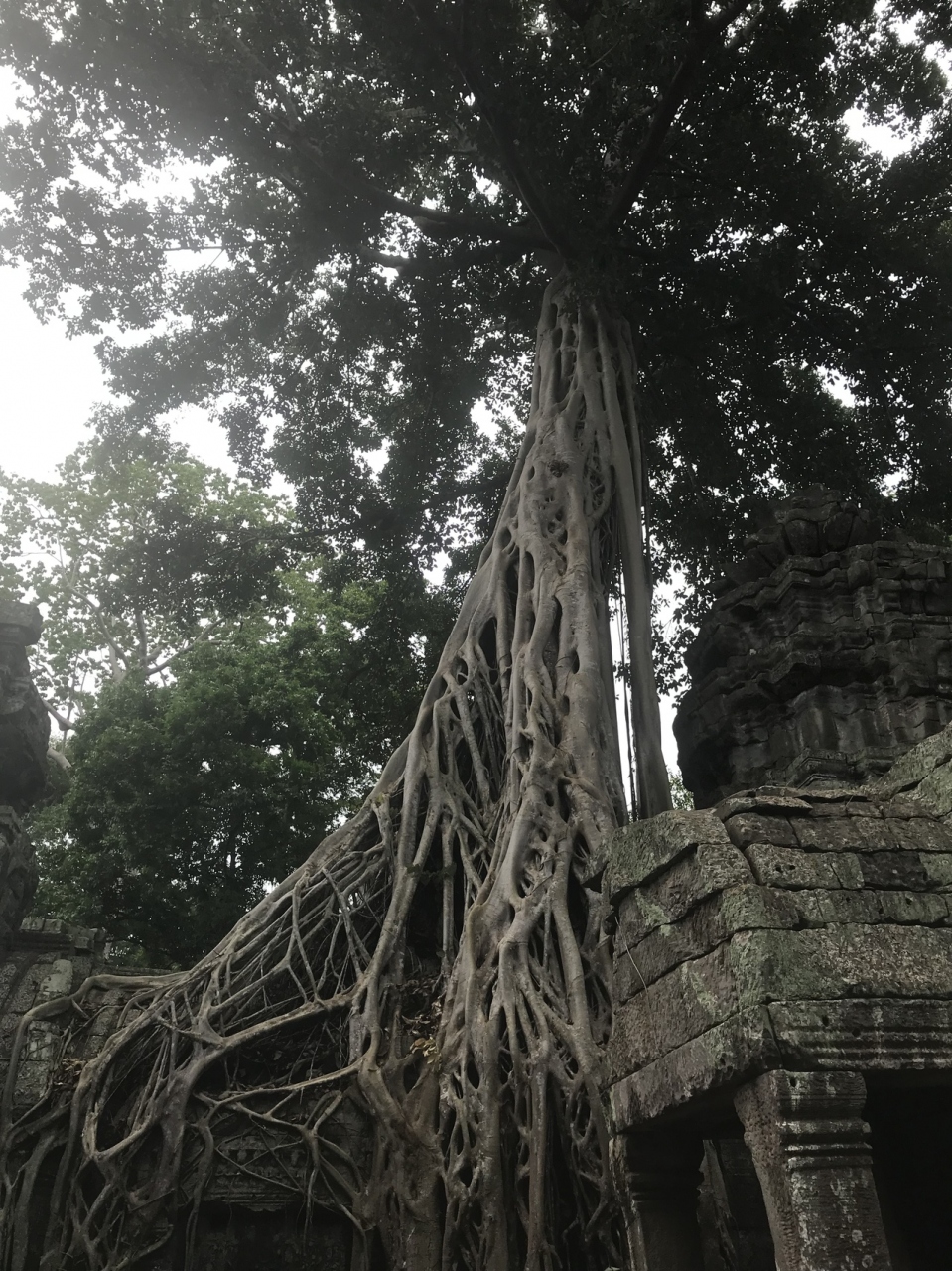 遺跡の中にガジュマルの根などが入り込み、まるでそれが長い年月を重ね樹木全体に飲み込まれていってしまいそうにも見えるとても神秘的な場所でした。