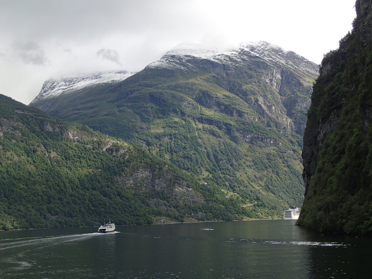 フッティールーテンの沿岸急行船でオーレスン〜ガイランゲルの往復クルーズに参加しました。最初の頃は雨でしたが、幸運にもガイランゲルフィヨルドを通る時は雨が上がり、はっきり見ることができました。至る所に滝があり、真夏にも関わらず山の頂上には雪景色も見られ、とても美しかったです。