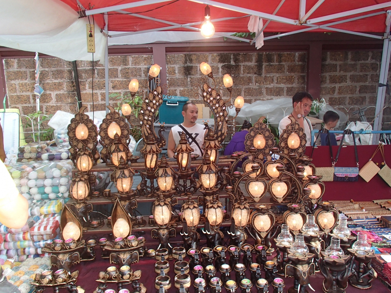 お土産の値段はナイトマーケットより安く成って居ますので、日程が合えば、ワロロット市場やナイトマーケットで下見してから行くと良いと思います。ナイトマーケットで売っている物はだいたい有った様な気がします。但し、すごい人出なのでゆっくり見て回るには大変です。早い時間だと空いて居ますが、まだ、店の準備が出来ていない店もありました。奥まで行って、夕食を取り戻る頃は、もう大変でした。PM8時頃は、道路一杯の人混みです。余談ですが、ジースやフルーツなどを買うとゴミの捨て場を探すのが大変です、地元の学生達がゴミ収集をしてくれている場所以外は捨てる場所が有りません、気をつけて下さい。