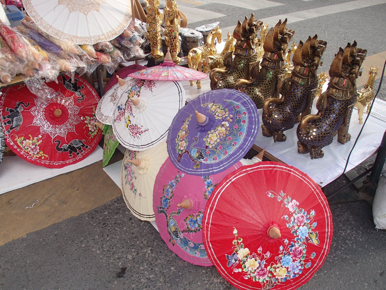 毎週日曜日に開催されています。ナイトマーケットとは違い、観光客だけで無く、地元の人も買物に来るのですごい人です。ターペー門から西に向かって、チェンマイ旧市街の中心部を貫き、脇道にも広がっています。両脇の店舗も営業していますが、中心はやはり屋台でした。また、道沿いの寺院の境内はフードコートに変わっていました。
