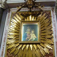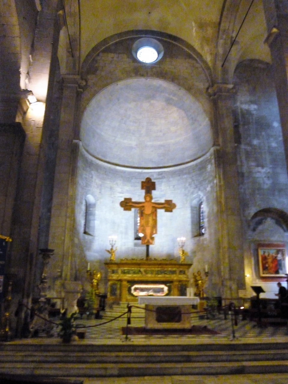 ルッカ中央地区の[サン ミケーレ イン フォロ教会]です。ルッカ様式(ロマネスク様式の流れ)な建物正面部(ファサード)が見事です/∩系アーチが何段も隙間なく並んでいること(柱廊)がルッカ様式?/天辺にはサン ミケーレ像(天使ミカエル)に! 祭壇には質素(見た目)ですが十字架は堂々と! `聖母子像`には感歎でした。