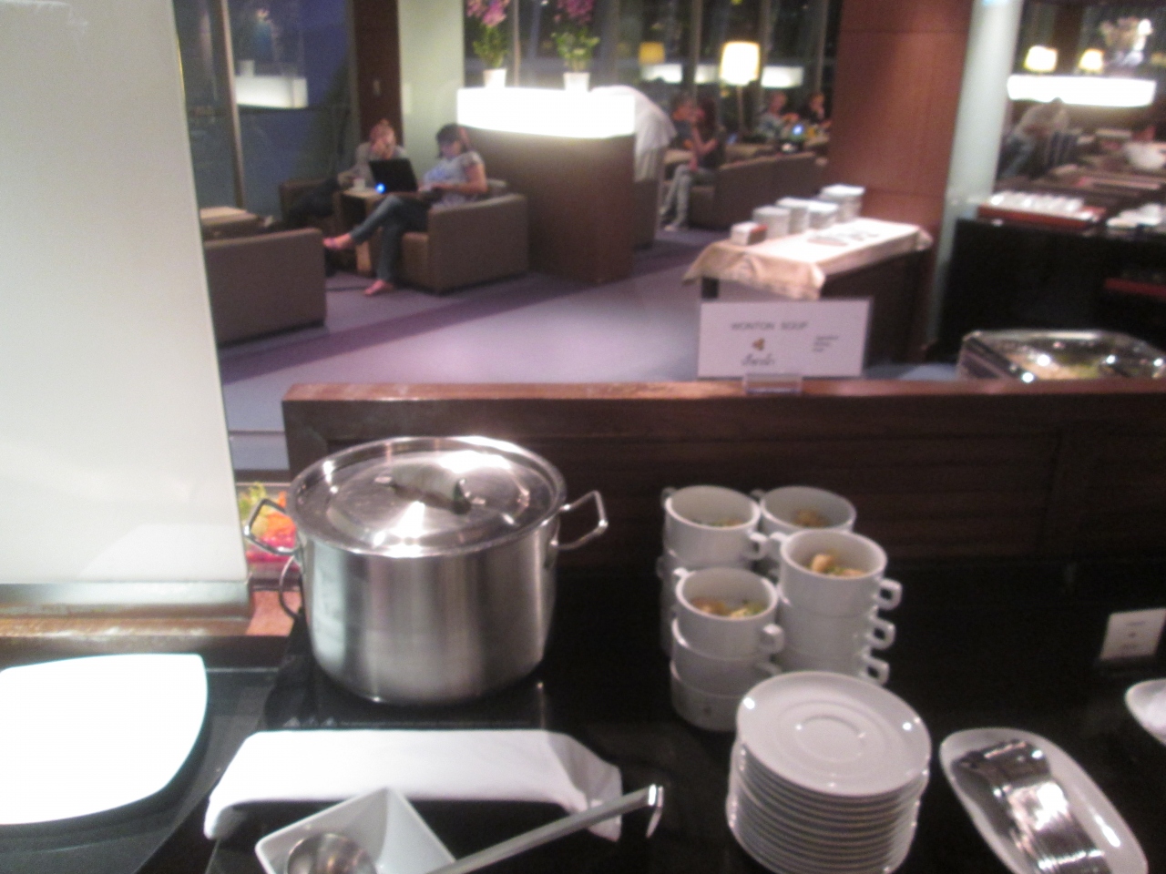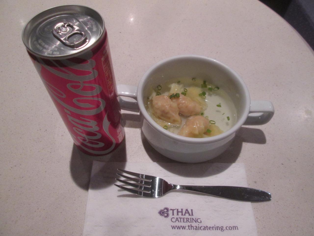 ロイヤルシルクラウンジのフードメニューにワンタンスープがありました。カップにワンタンが入っており、ひとつひとつのカップにラップが施されていました。スープは鍋からセルフで入れるスタイルでした。エコノミー席の機内食ではこういう温かい食事を提供されないので嬉しいサービスでした。