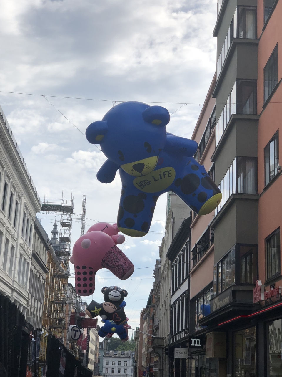 ノルウェー王宮付近からオスロ中央駅近くまで続くメインストリートです。ストリート沿いに飲食店、ブランドショップなどが並んでおり、地元の方々も歩いているようでした。メインストリートの脇道には、クマのバルーンが飾られていました。