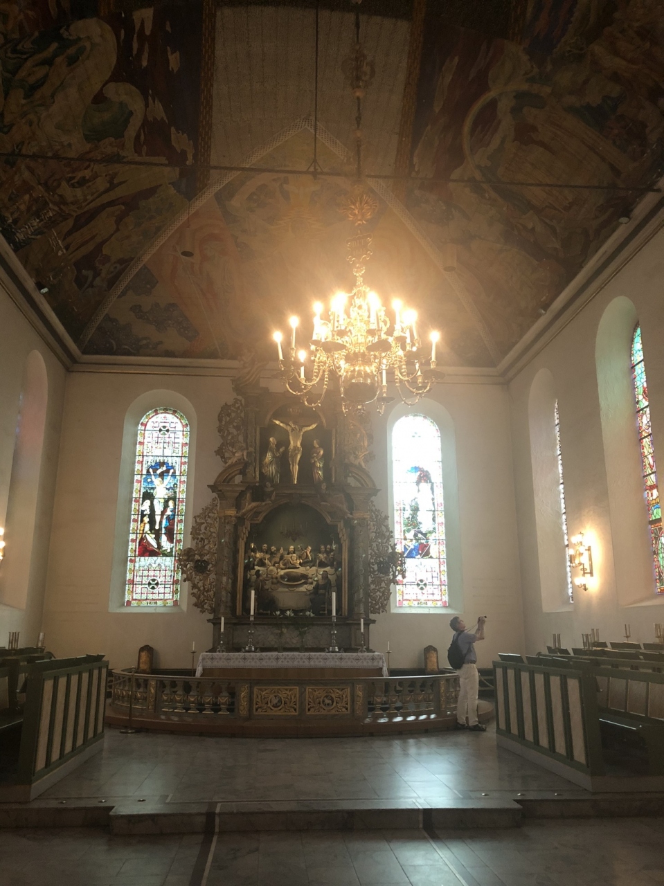 カール ヨハンスガテーテ通り沿いにある教会です。教会が閉まる16時の30分くらい前に入りました。通常、教会の天井は絵が描いてあったりするのですが、オスロ大聖堂の天井の場合、タペストリーが飾られていました。