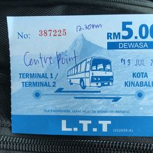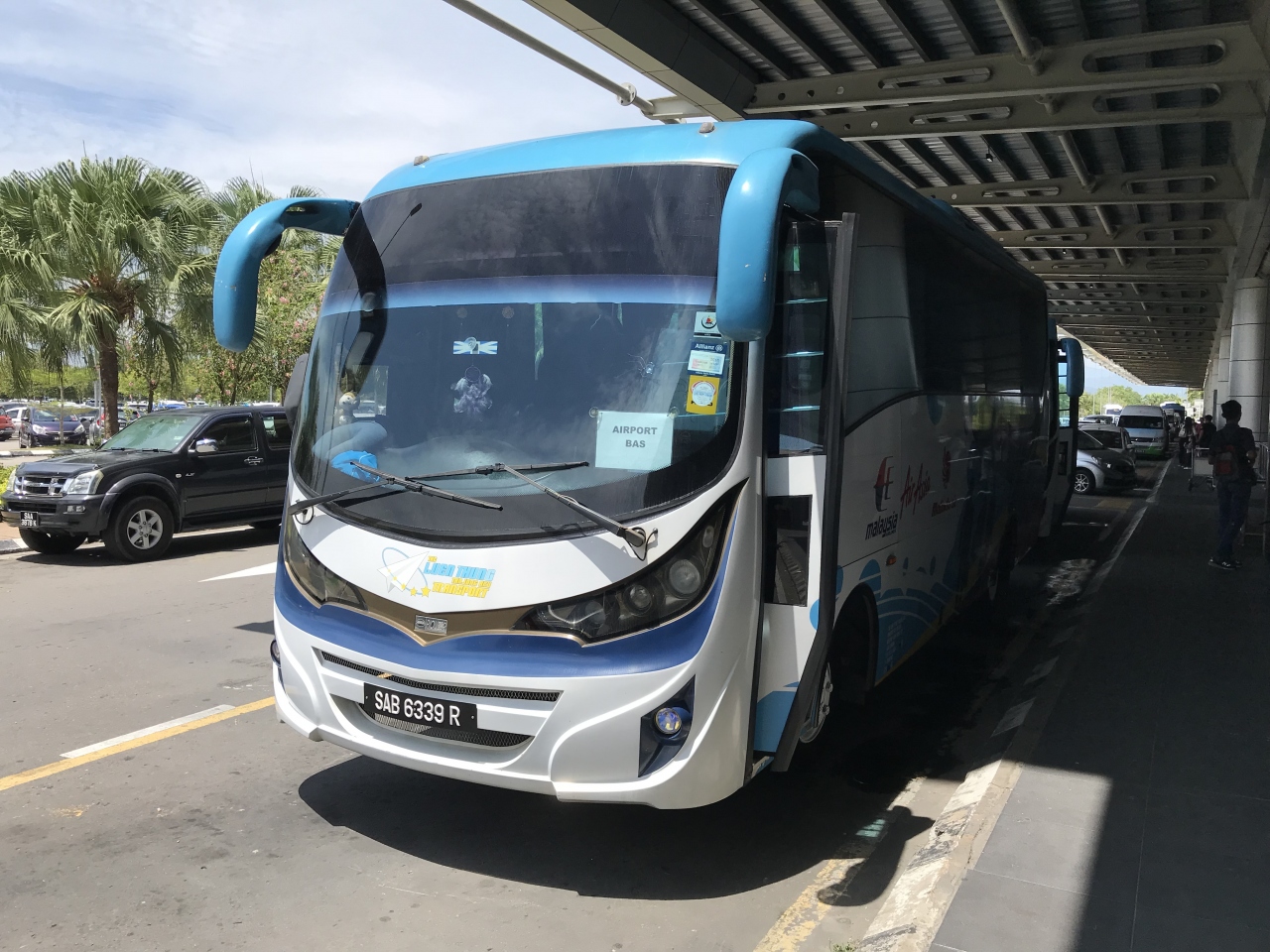 到着ロビーを出たところにカウンターがあり、チケットを購入します。料金は5リンギット。空港発は8時から45分間隔で20時30分まで。市内からは7時30分、8時45分のあとは45分間隔で19時30分まで。ガイドブックには所要時間45分となっていますが、昼の渋滞のない時間帯では10分強で市内に到着しました。道路が混雑する17時発のバスでHorizon Hotel近くのバス停から空港に向かった際は10分弱遅れでバスがやってきて、空港までの所要時間は25分ほどでした。空港から市内へ向かうバスは小型バスの座席が8割ほど埋まりましたが、空港に向かう際はほかに乗客は1人もいませんでした。
