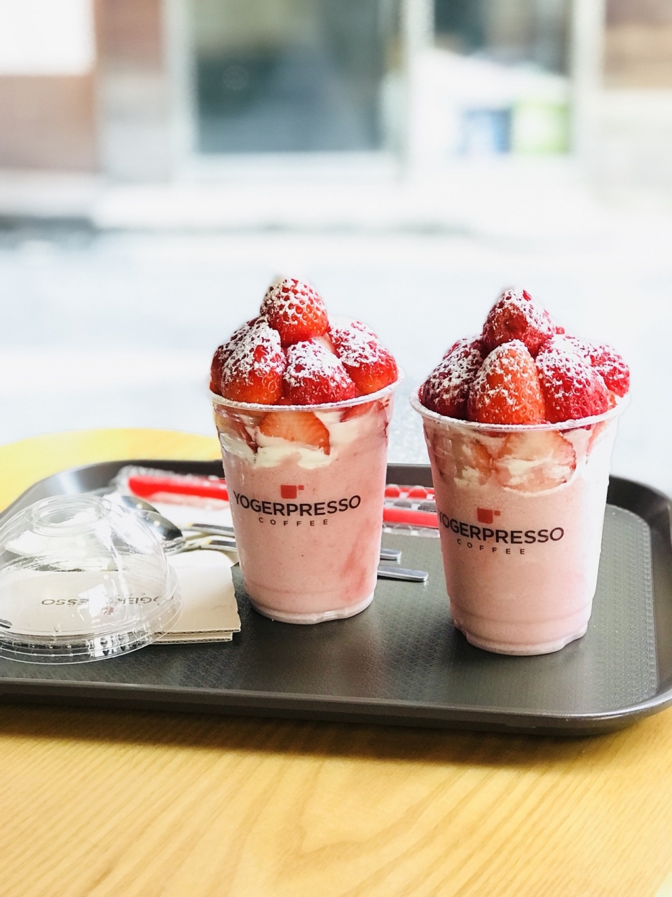 ヨーグルトスムージーの上にイチゴがたっぷり!