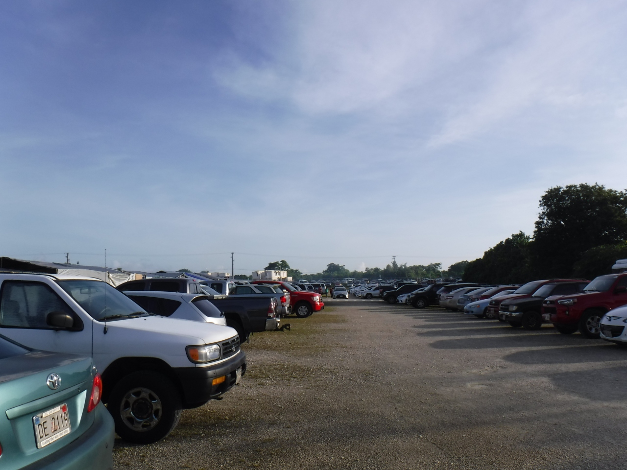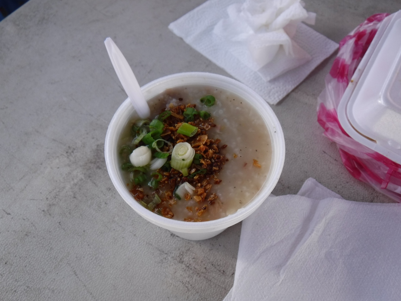 初めて朝市に行きました。レンタカーで行ったのですが、7時15分着で駐車場はほぼ満車状態。ですが奥へ行くと数台空いていたり、出る車もあったりでなんとか停められました。朝なのに暑いので、ぐるっと見て回るにはちょうどいい規模だと思います。朝食目当てで行きましたが、思ったより雰囲気がよく楽しかったです。トイレの壁面がインスタ映えな感じで、中もなかなか綺麗だったようです。krisはチャモロナイトマーケットにも出店しているので、もう一つの行列のお店で2チョイスのBBQプレート7ドルを購入。チキンとポークの串1本ずつとレッドライス、ヌードル(やきそば)をチョイス。私はポークのほうが柔らかくて好きでした。メッチャ美味しい!今日が帰国日なのが残念だが来て良かった---テント下にテーブル&イスがあるのでそこで食べました。向いのお店でgo to(ゴトー)というお粥も買いました。これまたメッチャ美味しい。にんにく効いていてしばらく臭いますが・・・BBQプレート買う行列に並んでいる間にBBQの煙をもろに浴びて、体中BBQの臭いがつきました。私と主人はリピートしたいですが、小学生の子どもたちは・・・今回行けて良かったです。