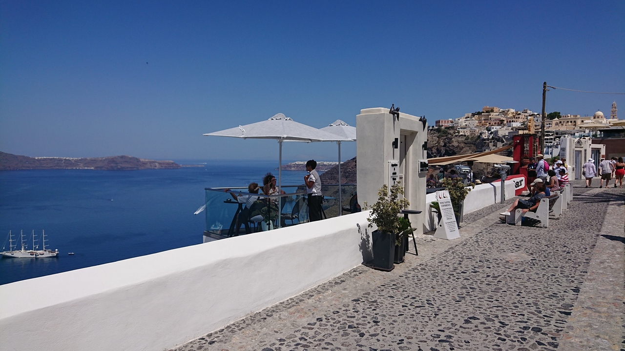 サントリーニ島の中心部にあり、最も観光客が多い街です。公営駐車場に車を停めて海側に歩いて向かったら、狭い路地までびっしりとショップやレストランがたくさん並んでいました。イアやイメロヴィグリと同じような風景の街です。滞在中、ずっと車を借りていたので人が多いフィラには長居しませんでした。