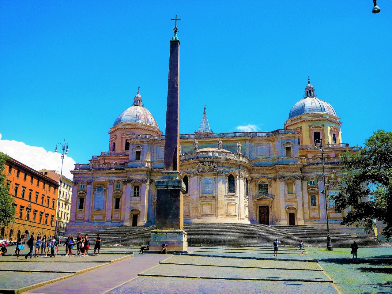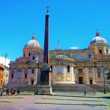 市内観光バスでテルミニ駅からスタートし、次に止まる停留所で降りると目に留まるのは`オベリスクがあるエスクイリーノ広場(ローマ七丘で`エスクイリーノの丘)`で見える[サンタ マリア マッジョーレ大聖堂]…一対の八角形クーポラの中に太い列柱の教会/半円形の館です(ファサードではなく裏手!)。4大聖堂の一つなので団体観光客(もしかして巡礼者)もいました。