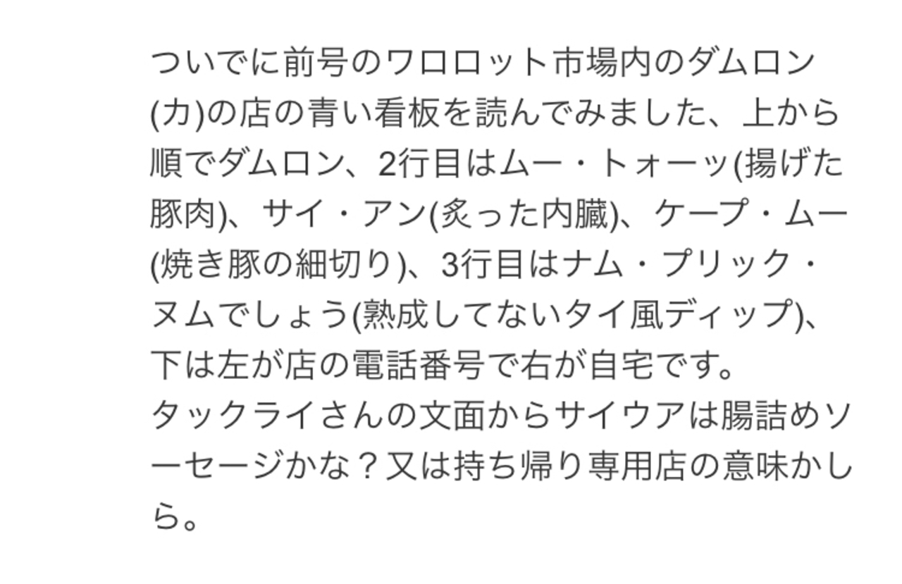 クチコミやってて【ダムロンDamrong チェンマイ】ってword見つけて、もしやこれは?って思ったら やっぱりそうだった!いや~、ダムロンって言うんだ!皆さん知ってた?ダムロン最高に旨いから、是非是非お試しあれ。。※ワロロット市場1F チェンマイソーセージ