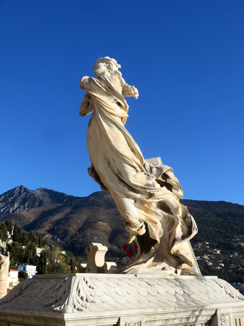 サンミッシェル教会向かいの路地を西に進み、住宅地の中を走る幅ひろい傾斜のきつい道を上がること10分弱、きついので、途中休みながらゆっくり登り、ようやく美しいビーチを見下ろす展望台に着きます。そこからの眺めもすばらしいのですが、横に墓地への入り口があり、フリーで入れました。この墓地には19世紀に避暑に来た名士たちが埋葬されているそうで、りっぱな墓が多く、墓地というより彫刻の展示会場のような、明るい雰囲気の墓地でした。墓地は階段で上にもあがれ、けっこう広いので、帰る道に迷うくらいでした。なにより、墓地からのビーチの眺めがすばらしく、マントンに来たら、絶対訪れてほしいところです。