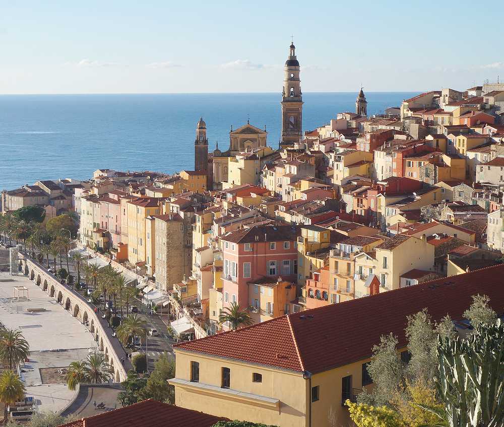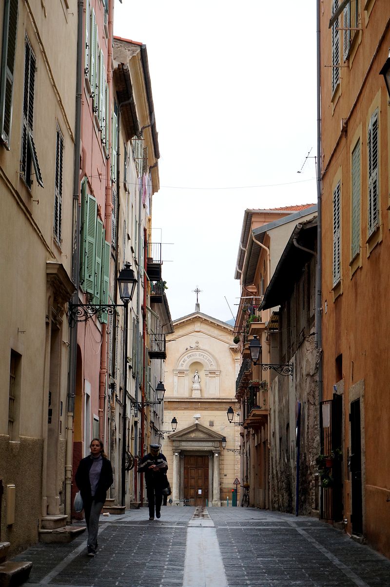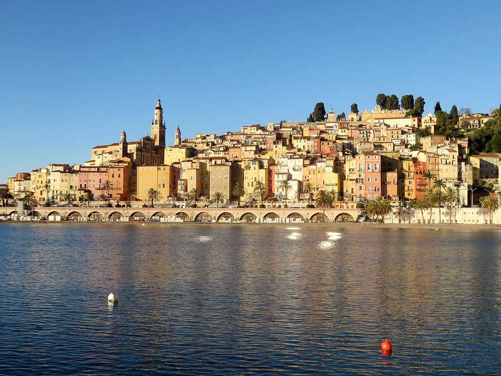 マントンはイタリアとフランスの国境近くにあり、地中海に面している高級リゾート地です。駅を下りると温暖な気候のためか街路樹にオレンジがなっていました。レモンはマントンの特産品となっています。駅から南東へ10分ほど歩くと市庁舎があり、さらに10分ほどシャレたお店が建ち並ぶ中を東に歩くと、道幅が狭い路地にそって淡いクリーム色や淡いピンク色の壁をした建物が密集したところに着きます。このあたりが旧市街で、その中ほどに2つの美しい教会(サンミッシェル教会など)が建っています。旧市街は、海沿いの道からかつてお城があった墓地のあたりまで続き、地中海の美しい青をバックに赤い屋根の家が密集して立ち並ぶ様は絶景です。なお旧市街の眺めはサンミッシェル教会横の階段を下りて、ビーチに下り、桟橋からもながめることができます。