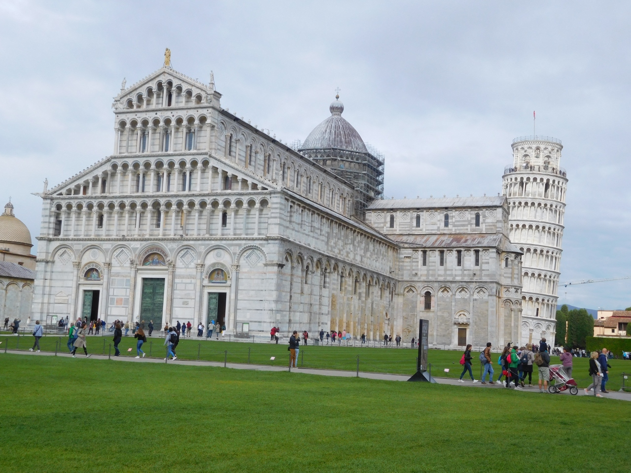 ドゥオーモのある広場です。ピサの斜塔もここにあります。フィレンツェやルッカから行くには、トレニタリア(イタリア鉄道)でピサ中央駅まで行き、そこからはバスで往復です。家族連れやカップルでにぎわっています。多くの観光客が、斜塔を支える写真を撮っています。