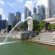 水を吐くマーアイオンの向こうにはラッフルズ プレイスの高層ビル群が建っています。