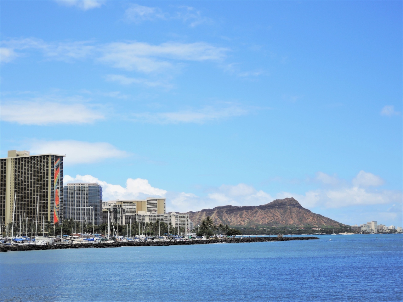 ダイヤモンドヘッドを背景にワイキキのホテル群からビーチまで一望できます。