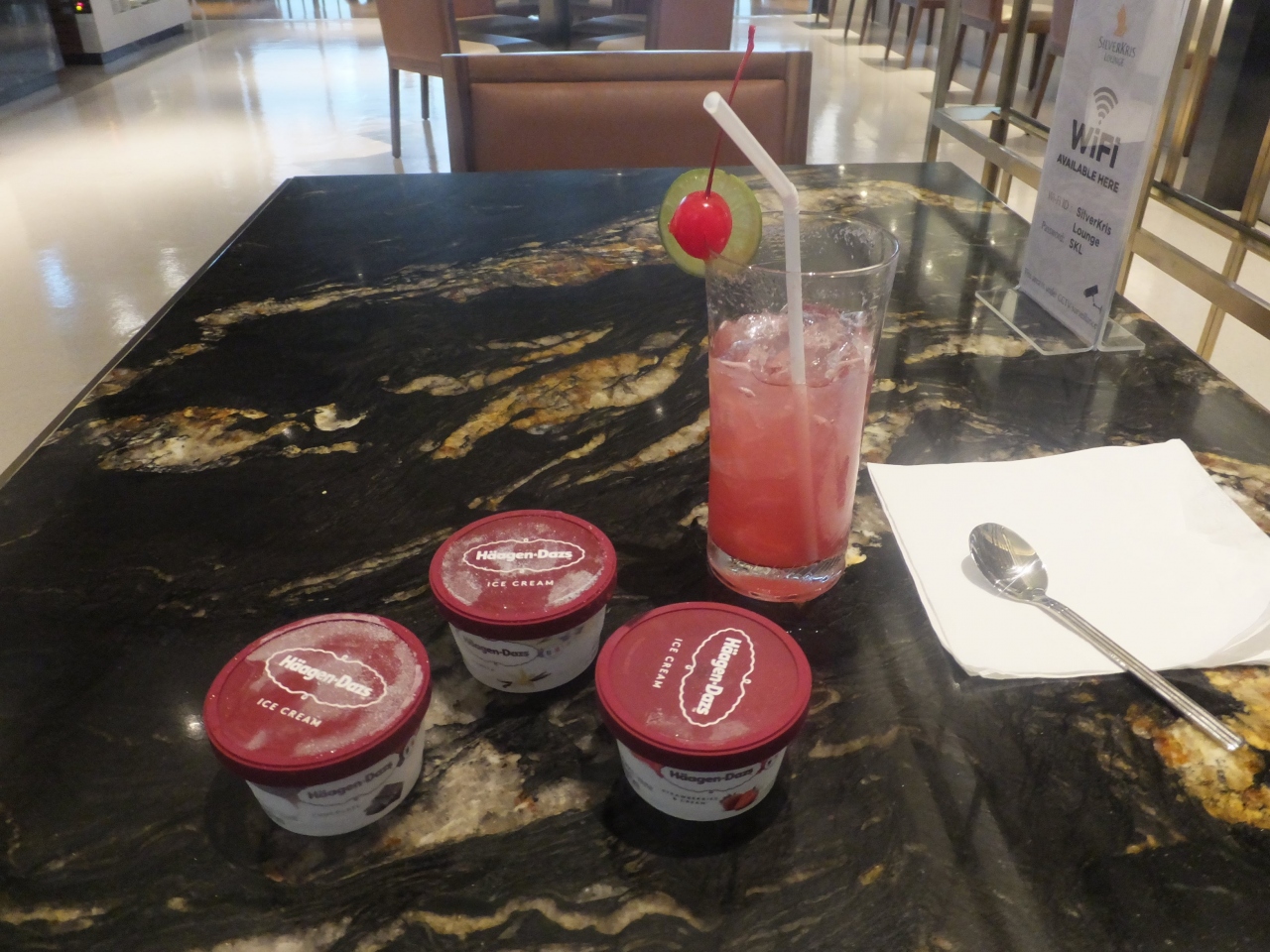 - 種類が豊富で美味。ハーゲンダッツが3種類あった(バニラ・チョコ・ストロベリー)。シンガポール航空のラウンジだから当然の如くTWGの紅茶も。
