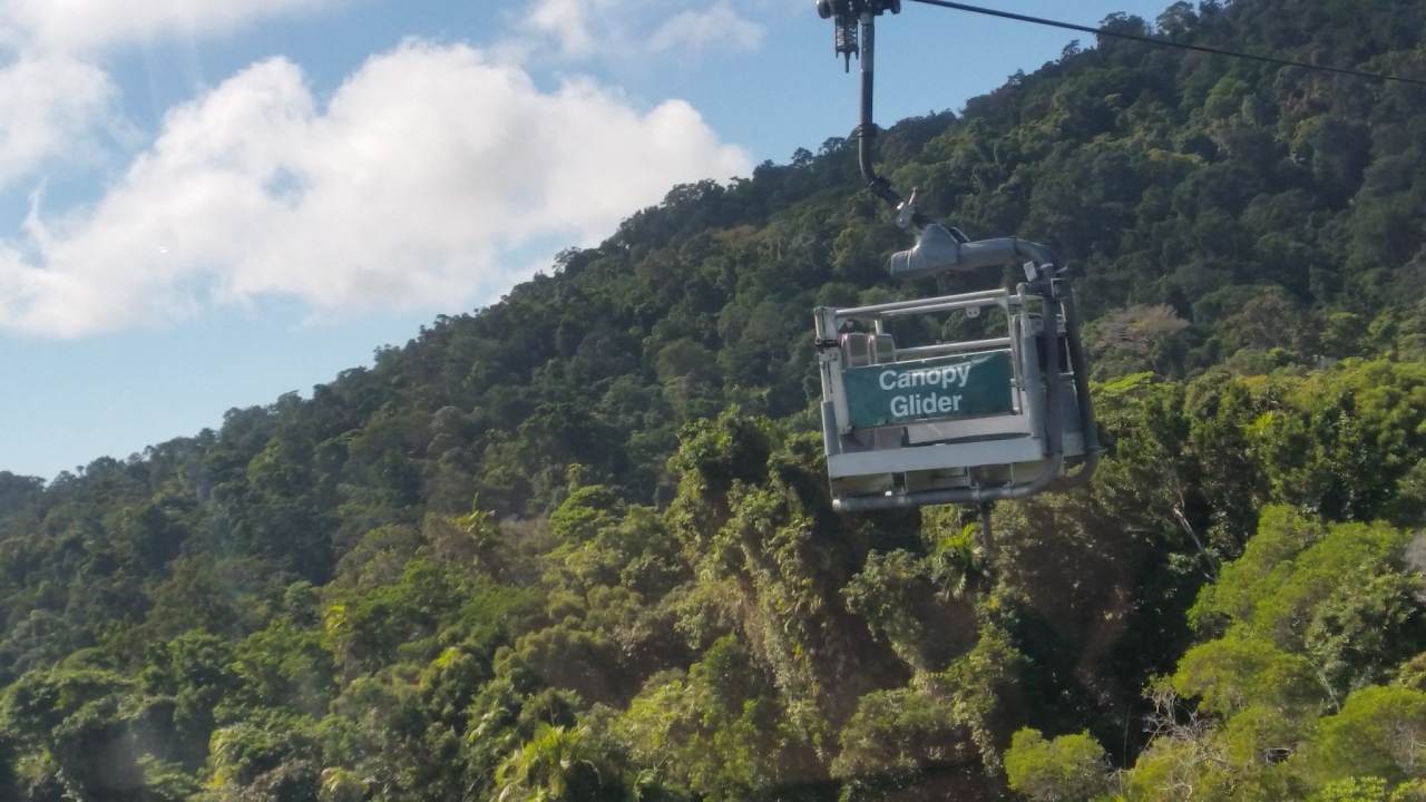 「キュランダ観光デラックス」ツアーで利用しました。スミスフィールド駅からレッドピーク駅、乗り継ぎキュランダ駅まで乗車しました。6人乗りのゴンドラですが、混みようによって、2人や4人でも1台に乗せてくれます。ゴンドラの眼下に、熱帯雨林やバロン滝、バロン川、海が見えます。床下が透明のダイヤモンドビューは10豪弗追加で乗れます。10台に1台くらいの割合です。世界で最も環境に配慮して建設されたそうです。