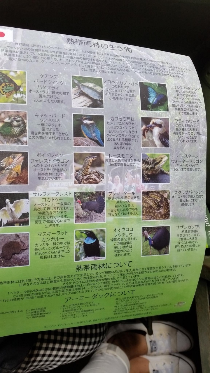 「キュランダ観光デラックス」ツアーで訪問しました。初めにフリーでコアラを抱っこして写真を撮ったり、カンガルーに餌をやったり。クロコダイルやディンゴ、タスマニアンデビルもいました。それから皆で、「アーミーダック」(水陸両用車)に乗車して熱帯雨林や池の中を探検しました。要所要所で止まり、説明してくれ、楽しかったです。