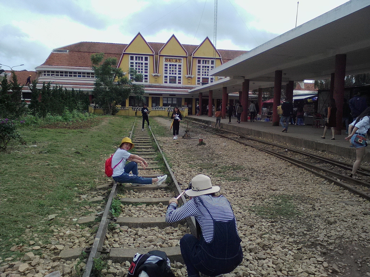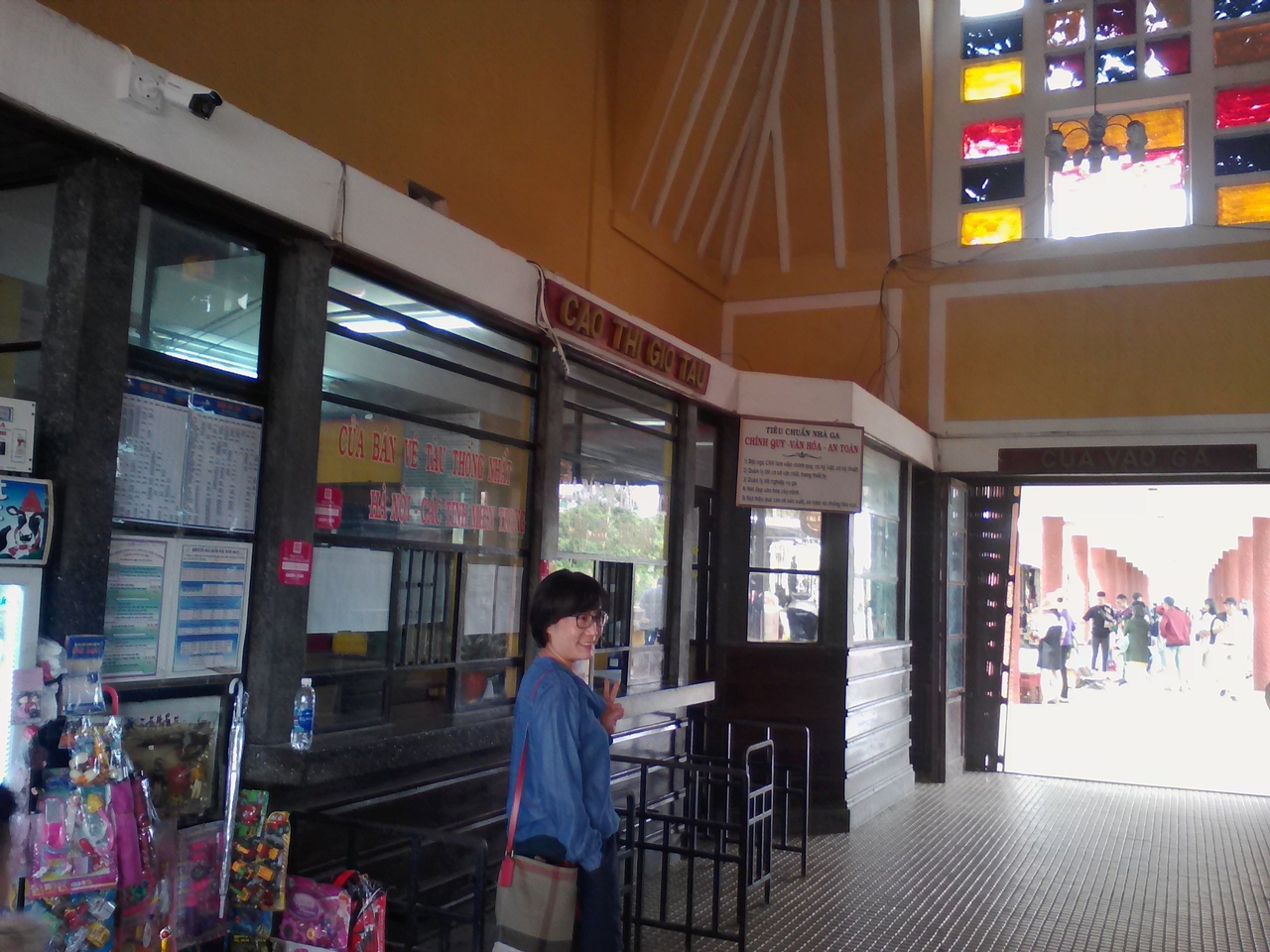 駅(敷地内)に入るには入場料5000ドンかかります。駅舎は外観、内部もなんともノスタルジックを感じされる造り。ホームにはかつて使用されていた蒸気機関車も展示されており、客車はカフェになっています。ベトナム人も大勢やって来てあちこちで記念撮影していました。見学だけという方もどうせなら列車の発着の時間に合わせて行けばさらに楽しめると思います。