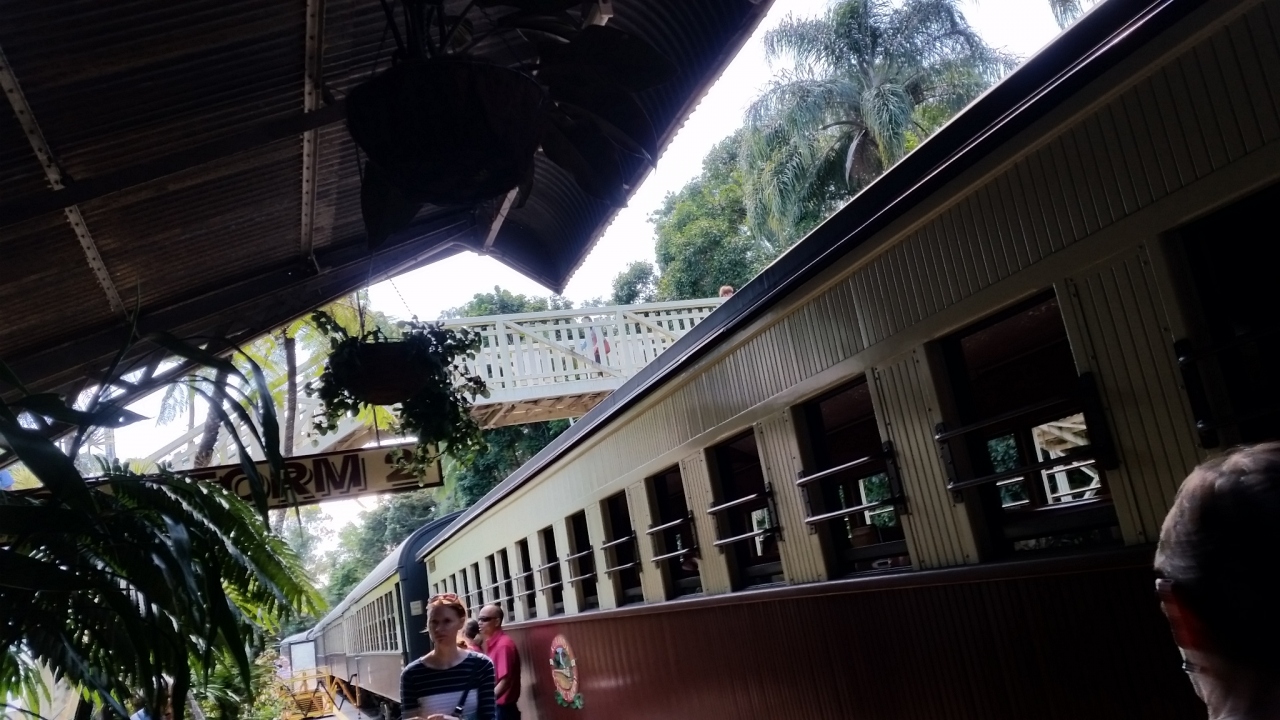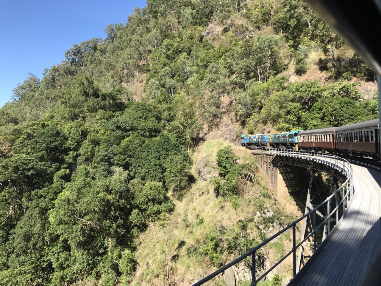 「キュランダ観光デラックス」ツアーで利用しました。キュランダ駅発15:30を、駅の窓口で14時に変更して貰い乗車しました。手数料は無料。車両はレトロな感じで、向かい合って6人席ですが、空いていて、2人で1ボックス利用しました。バロンフォールズ駅で10分停車、下車して、見晴らし台に登って、バロン滝を見たり、写真を撮ったりすることができます。見どころではゆっくり走り、曲がり角では先頭車両の写真を撮ることもできます。のんびり楽しめました。