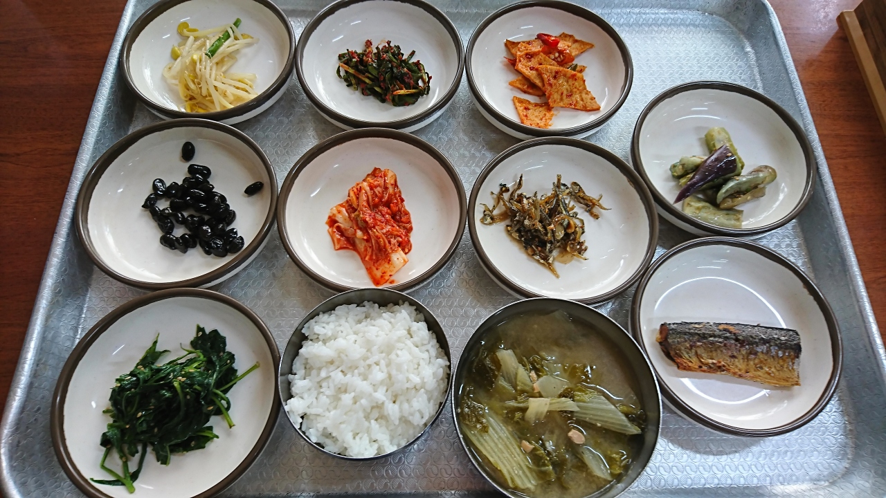 すぐに、9品のおかずとごはん・スープが大きなお盆に載ってきました。