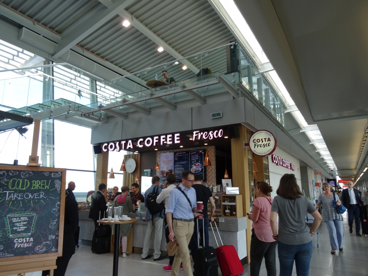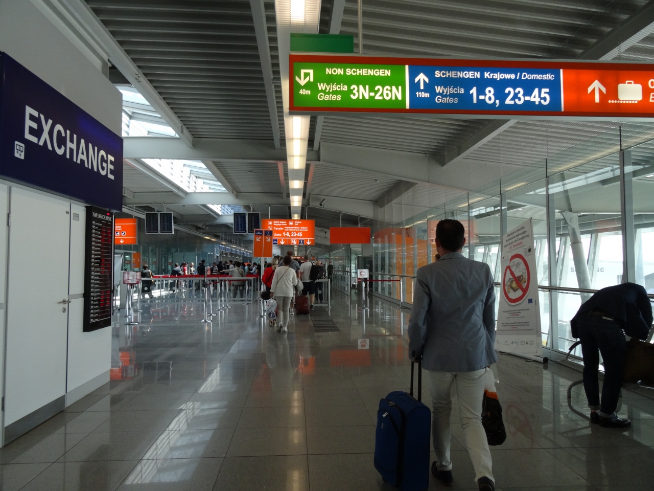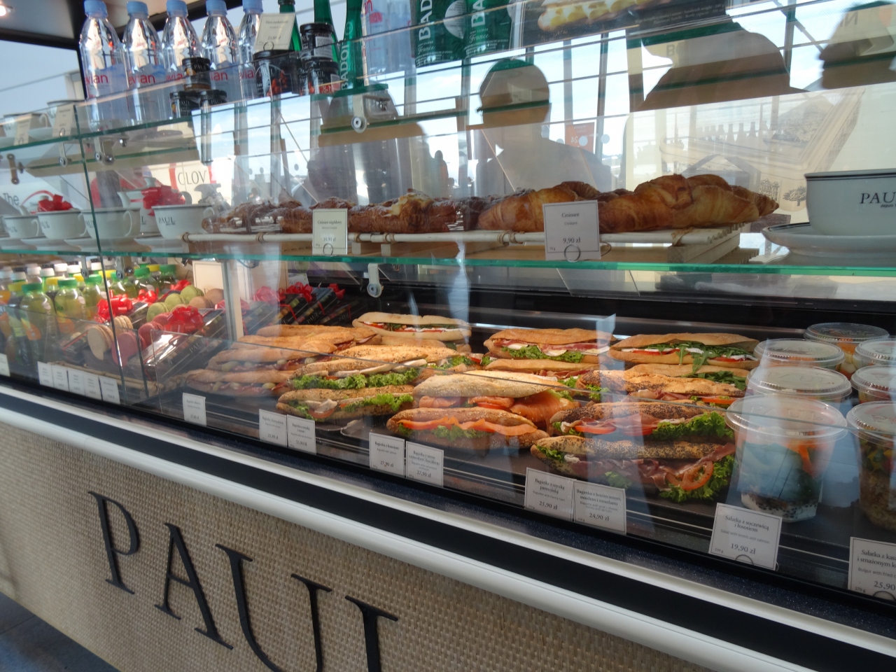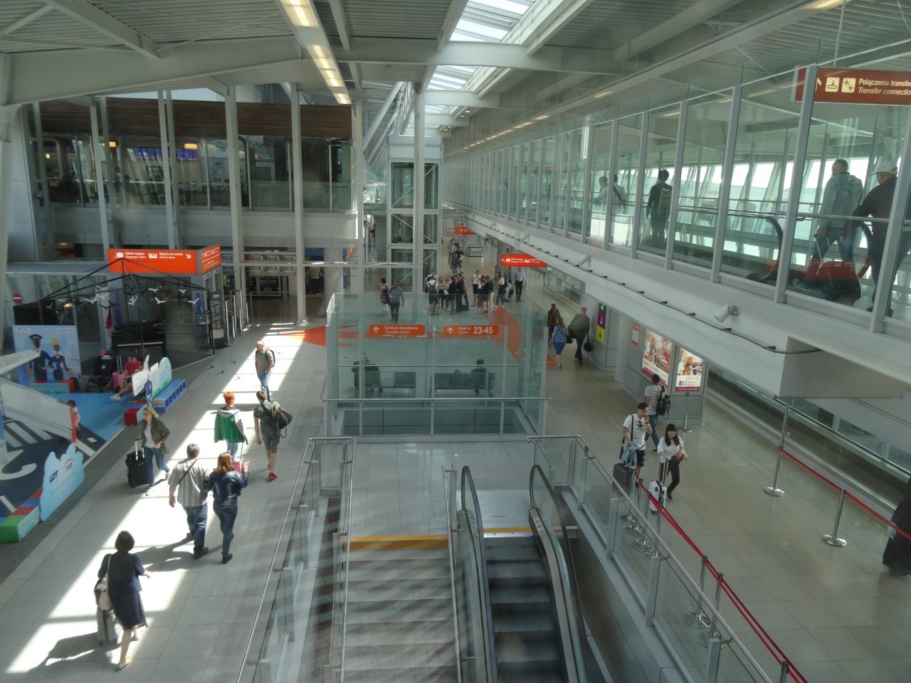 出発ロビーが2階(ポーランド式だと1階)、到着ロビーが1階(ポーランド式だと0階)にある。どちらのフロアにもカフェがあり、また到着ロビーにはマクドナルドとマックカフェ、COSTA COFFEE(STAR BUCKSのようなカフェ)などがある。また、搭乗フロアにはフランスの老舗「PAUL」もあった。