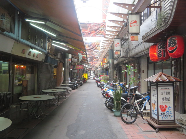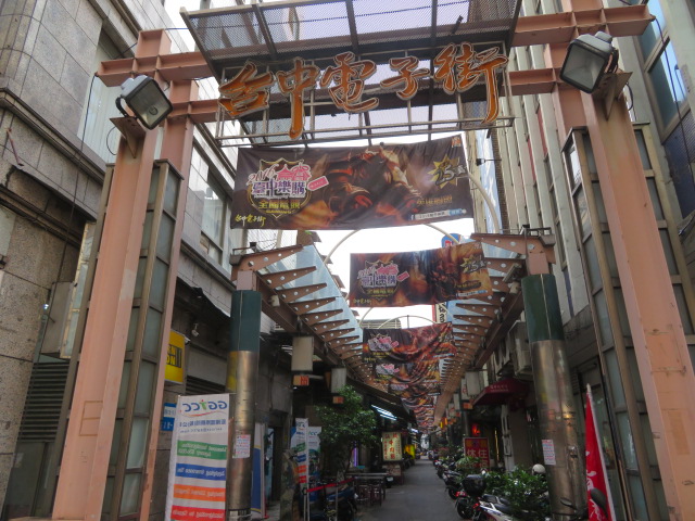 台中駅前からメインストリートの台湾大道を5分程歩くとあります、アーケード街になっていて入口付近とアーケード街に電子電機製品・部品を販売するお店が並んでいます、飲食店もありました、小さなお店が多いです、アーケード街は昼間でも薄暗くて人が少ないので活気がなく見えます、歩くとケイタイの関連部品が並んでいるのが目立ちました。