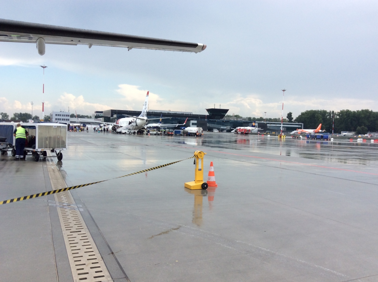 中央駅から、バスで30分、電車だと20分くらいかなあ?バスにも種類があって、直通だと早いけど料金は3倍?。路線バス45分くらいかかり、安い。電車は直通バスと同じ料金。空港のビルのすぐ前がバスの乗り場。電車はブリッジを進み、道路をまたぐ。駅のバス乗り場はターミナルの一角。空港自体は小さいので、利用しやすいかな?