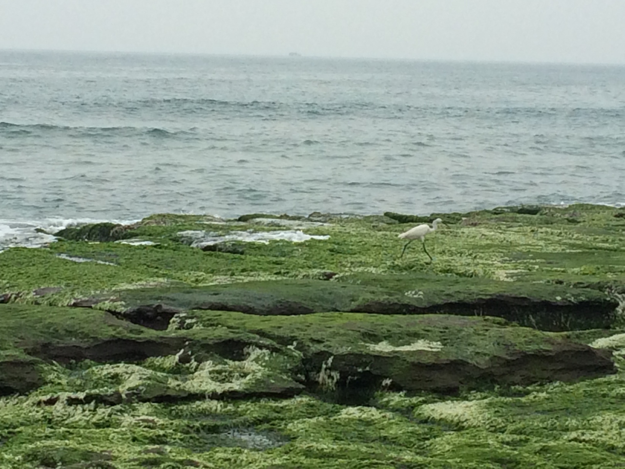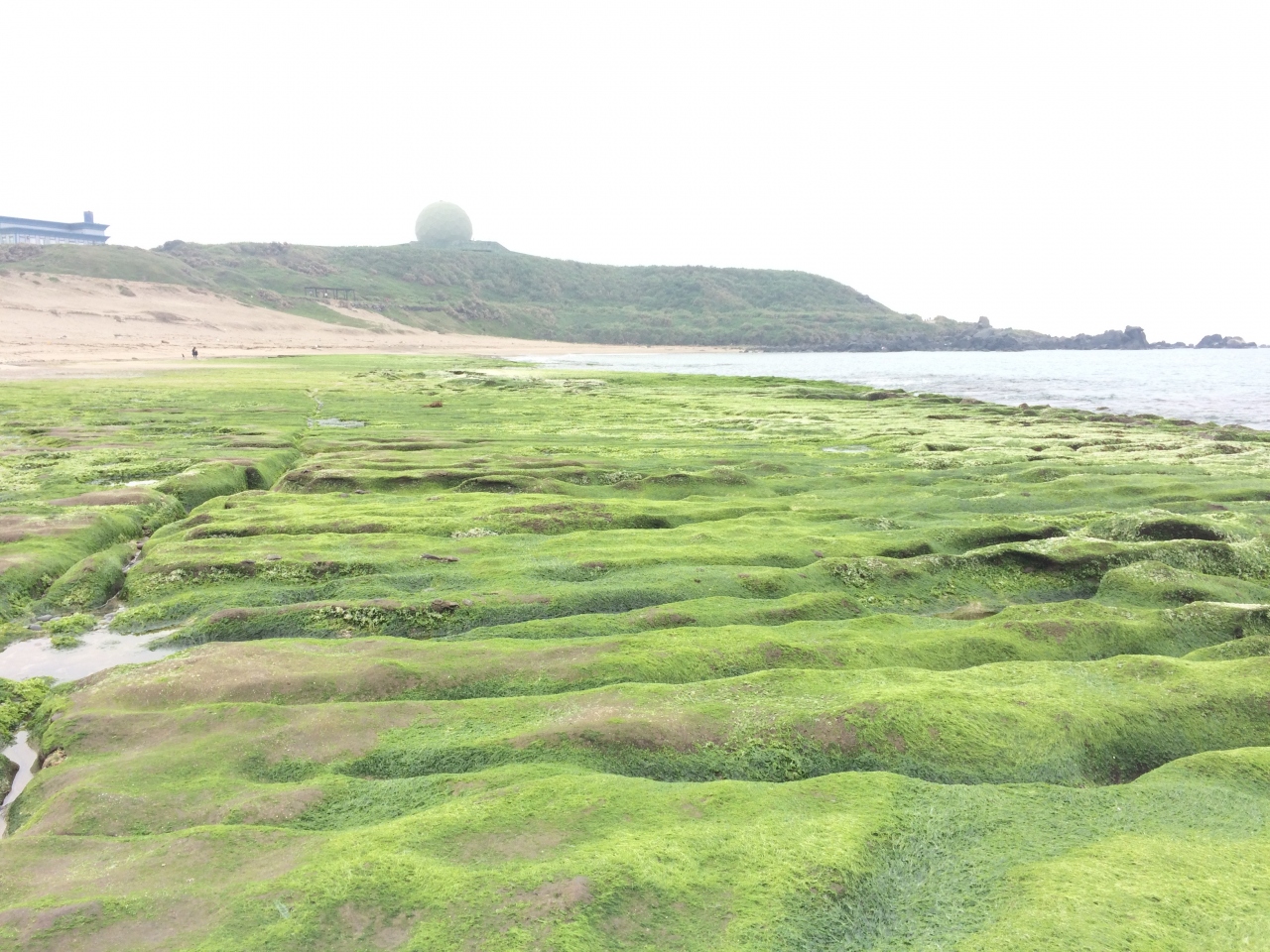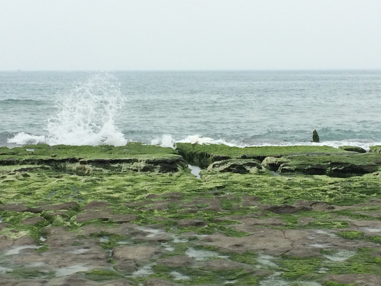 台湾,北海岸最北端の富貴角灯台の麓にある老梅ビーチ。ここで,毎年一時期だけ緑の絨毯で敷き詰められる。それが,老梅緑石槽。ようは海草です。海岸から,海に向かってなんとなく直線的に伸びる石の表面に繫生するそうで,これを見に多くの観光客が訪れます。