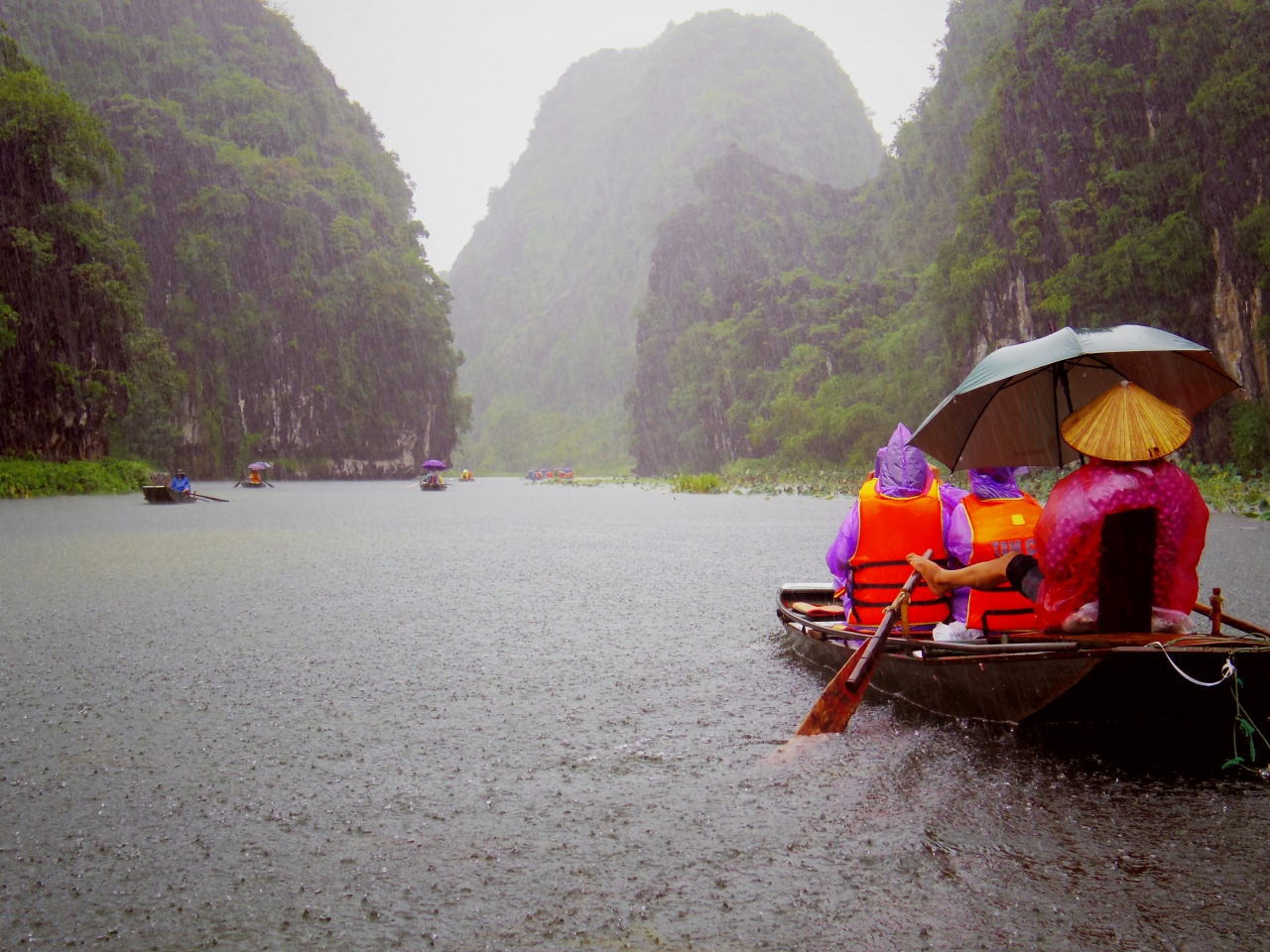 豪雨の中、びしょ濡れになりながらのボートツアーでしたが、雨に煙る風景はとても幻想的でした。