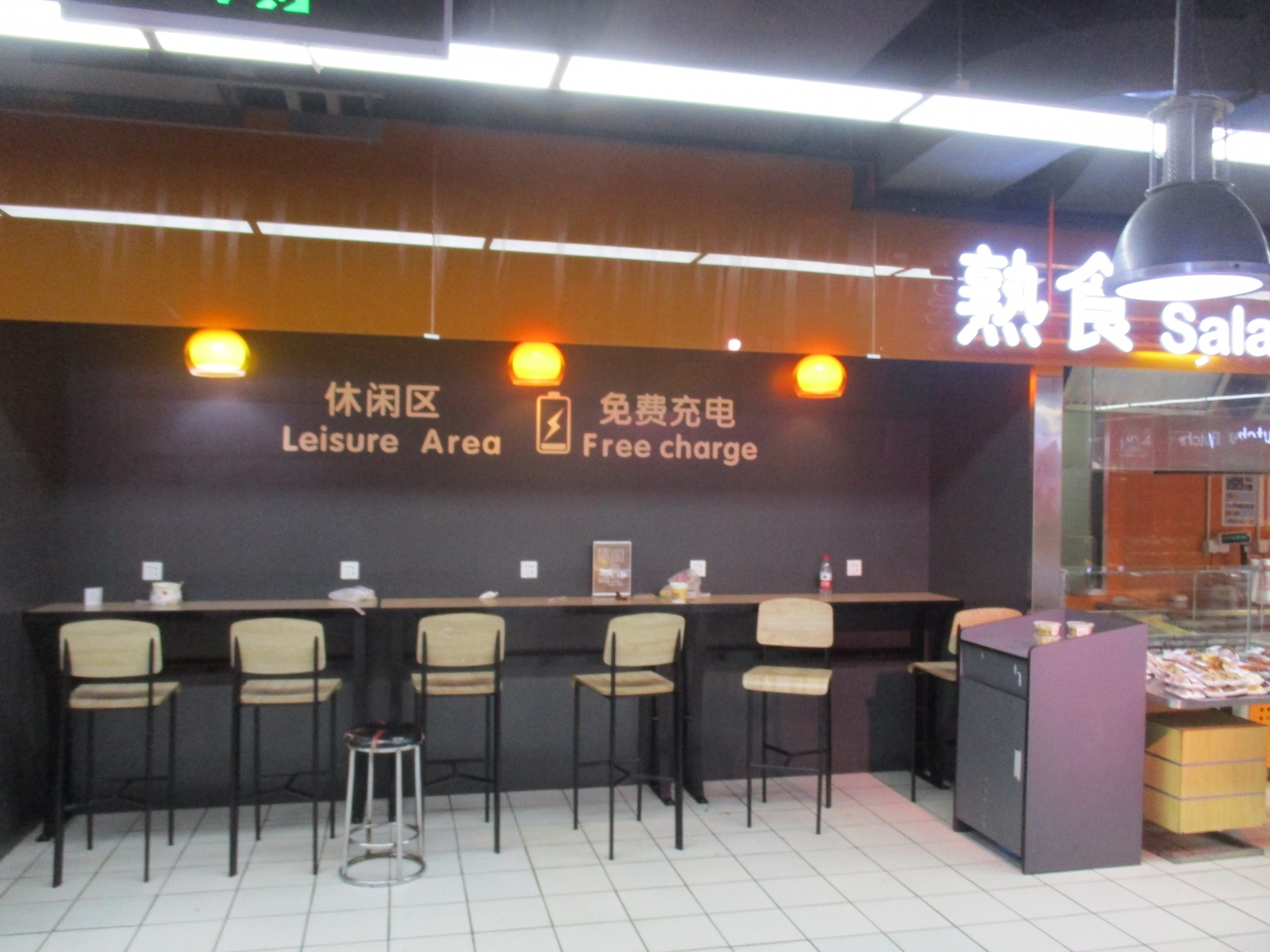 家楽福のスーパーの一角にイートインスペースがありました。購入した商品をこちらで休憩がてら利用することができました。スマホの充電設備もあり、サービスの良いスーパーだと思いました。上海でもイートインを採用しているスーパー、コンビニが増えた印象を受けました。