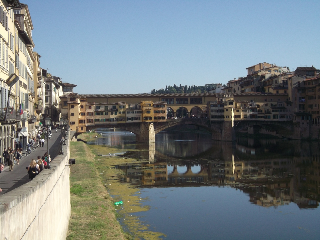 アルノ川に架かる橋の中でもひときわ目立つヴェッキオ橋。派手なつくりの外観も見事で見ごたえがありますが、橋の上に軒を並べる宝石店などの華やかな雰囲気にも驚かされます。橋の近辺はかなりの混雑なので、宝石などに興味の無い方は少し離れたところから橋の全体を眺めるのが良いでしょう。